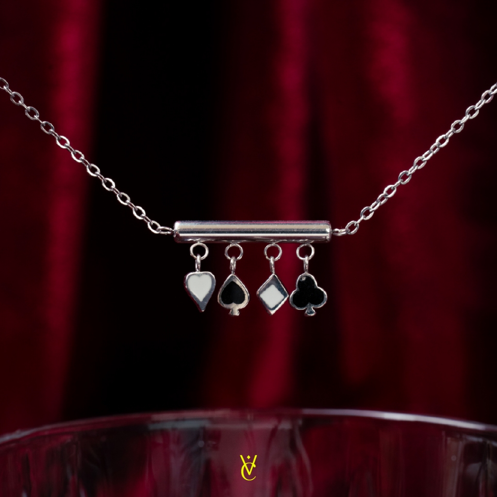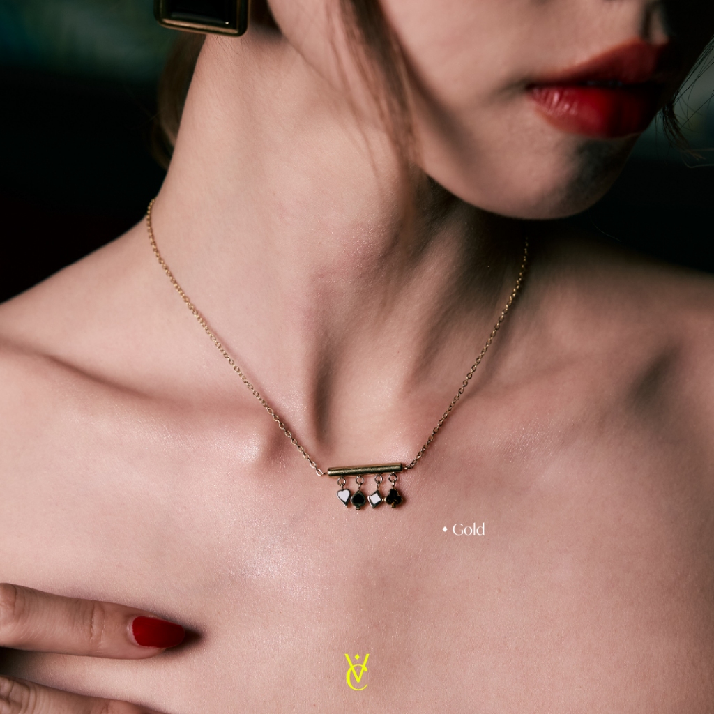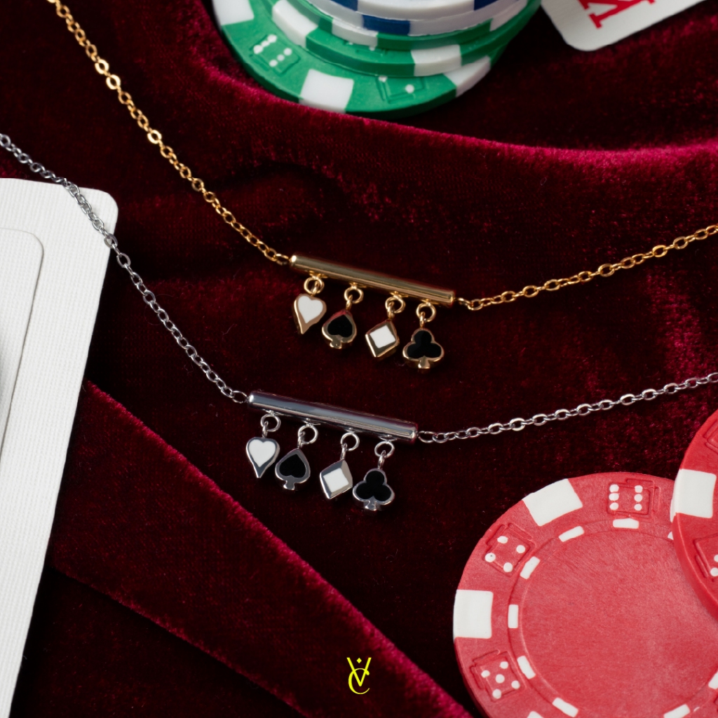 ♠️ Lucky Bao Suit Necklace Gold/ White Gold (Length 40+5 cm - 1490.-) สร้อยคอดีไซน์สัญลักษณ์บนไพ่ทั้ง 4 ตัวห้อยเป็นจี้เรียงกัน เส้นนี้เก๋มาก ใครหาสร้อย Lucky Charm ใส่ติดตัวอยู่ เส้นนี้ต้องมีค่ะ