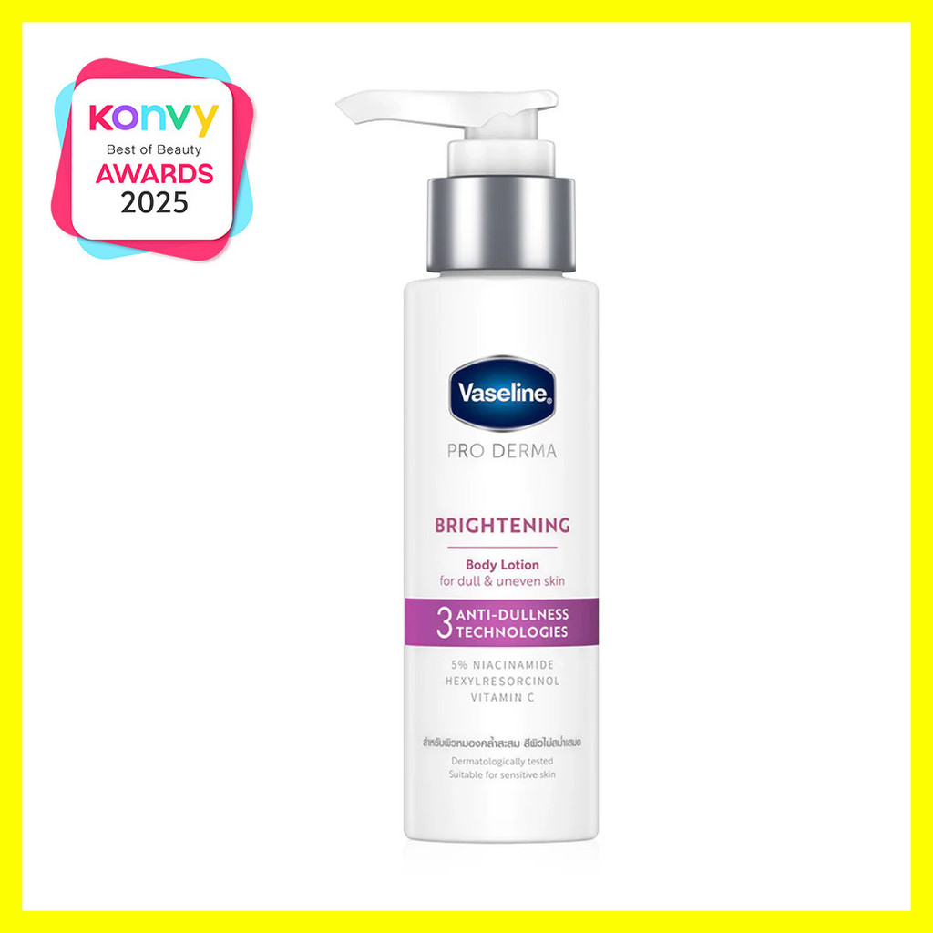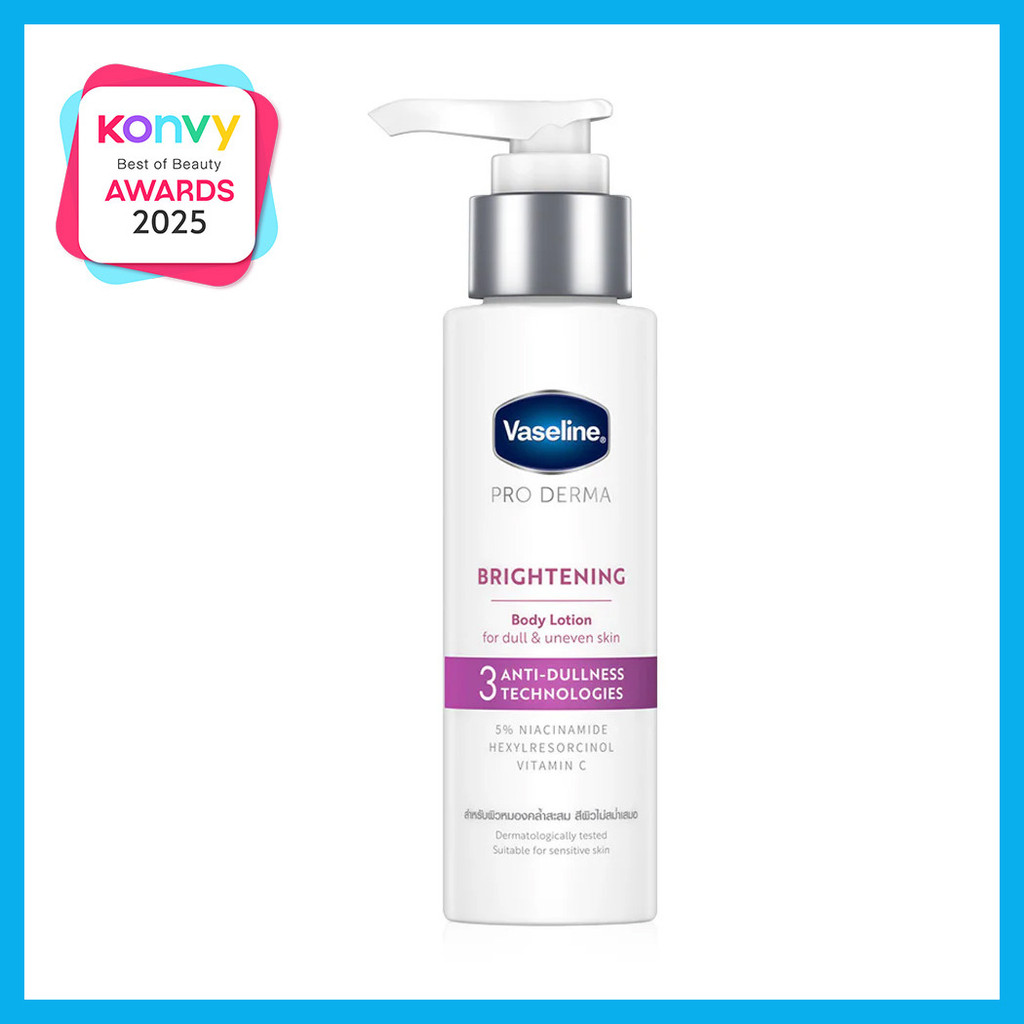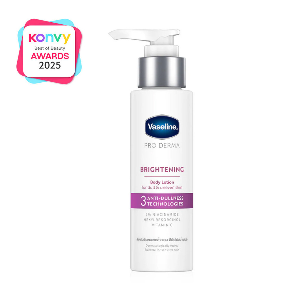 Vaseline Pro Derma Brightening Body Lotion 70mlโลชั่นเซรั่มเข้มข้น ที่ผสานไนอาซินาไมด์บริสุทธิ์ เฮกซิลรีซอร์ซินอล และวิตามินซี จัดการต้นเหตุผิวหมองคล้ำและจุดด่างดำ เผยผิวดูกระจ่างใส เปล่งประกาย พร้อมช่วยฟื้นสมดุลไมโครไบโอม ที่เป็นเกราะปกป้องผิว