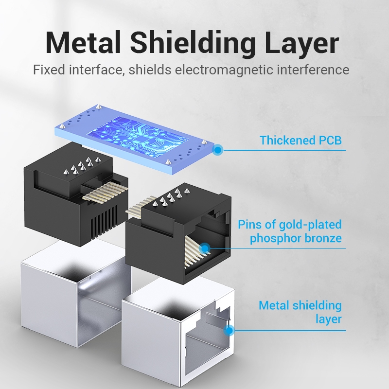 หน้าสัมผัสชุบทองของตัวเชื่อมต่ออีเธอร์เน็ตตัวเมียกับตัวเมียซึ่งป้องกันการเกิดออกซิไดซ์และคลิปยึดแบบสแน็ปอินที่ง่ายช่วยให้มั่นใจได้ถึงการเชื่อมต่อที่ปลอดภัยและปราศจากการกัดกร่อน