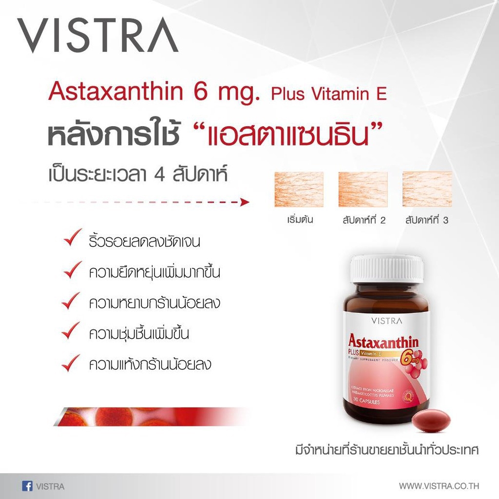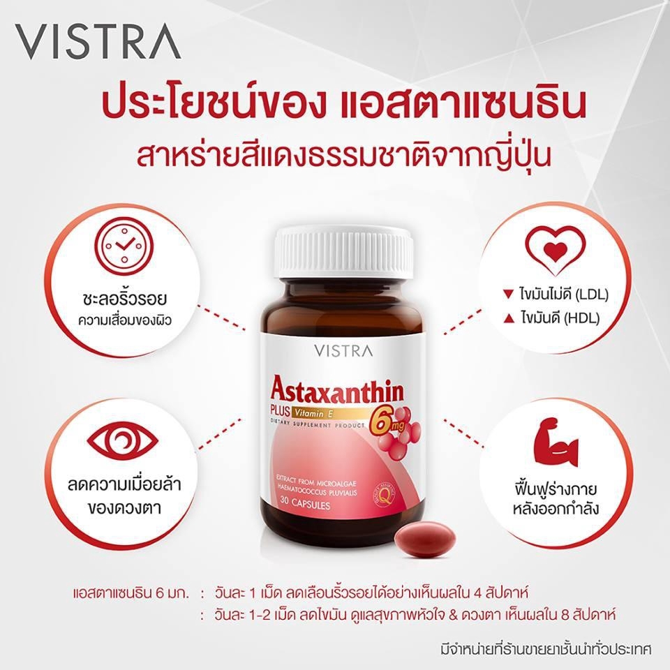 วิสทร้า แอสตาแซนธิน 6 มก. (ผลิตภัณฑ์เสริมอาหาร) 1 เม็ด ให้แอสตาแซนธิน 6 มก. ด้วยสารชะลอวัยกับสาหร่ายสีแดงเกรดพรีเมี่ยมจากประเทศญี่ปุ่น ลิขสิทธิ์เฉพาะของ AstsREAL ที่เปี่ยมไปด้วยพลังแห่งสารต้านอนุมูลอิสระเพื่อคงความอ่อนเยาว์และชุ่มชื่นของผิวพรรณ บอกลาปัญหาริ้วรอยก่อนวัยมีประสิทธิภาพและมีเอกสารงานวิจัยทางวิทยาศาสตร์รับรอง