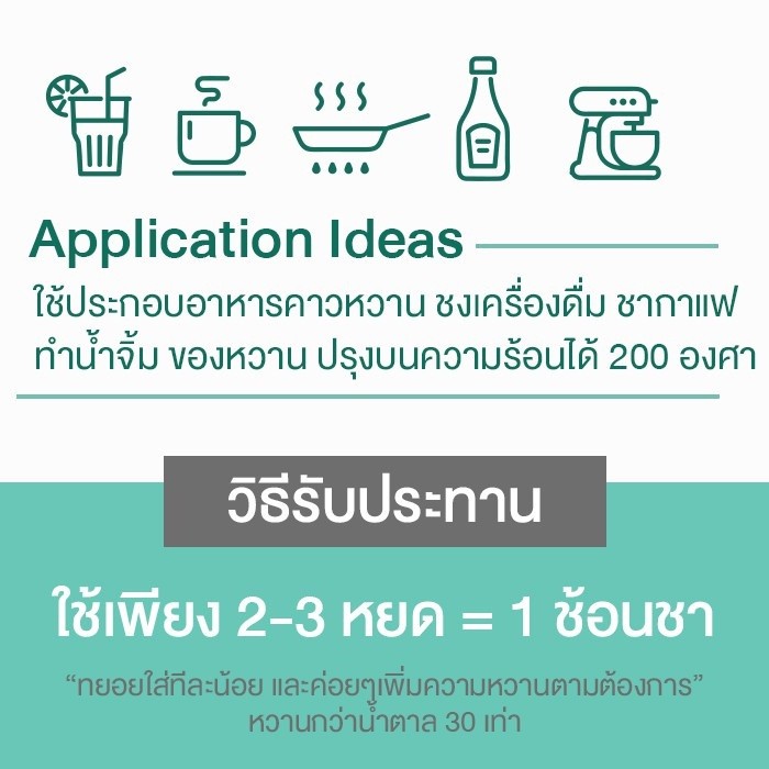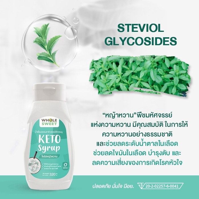 น้ำเชื่อมหญ้าหวานสูตรคีโต ใช้แทนน้ำตาลทราย เหมาะสำหรับผู้รักสุขภาพ ผู้ที่ควบคุมน้ำหนัก และผู้ป่วยเบาหวาน สามารถใช้ประกอบอาหารหรือชงเครื่องดื่มได้ทุกประเภท ทั้งอาหารคาว อาหารหวาน ชา กาแฟ ขนม หรือซอสต่าง ๆ โดยไม่ทำให้เสียรสชาติ