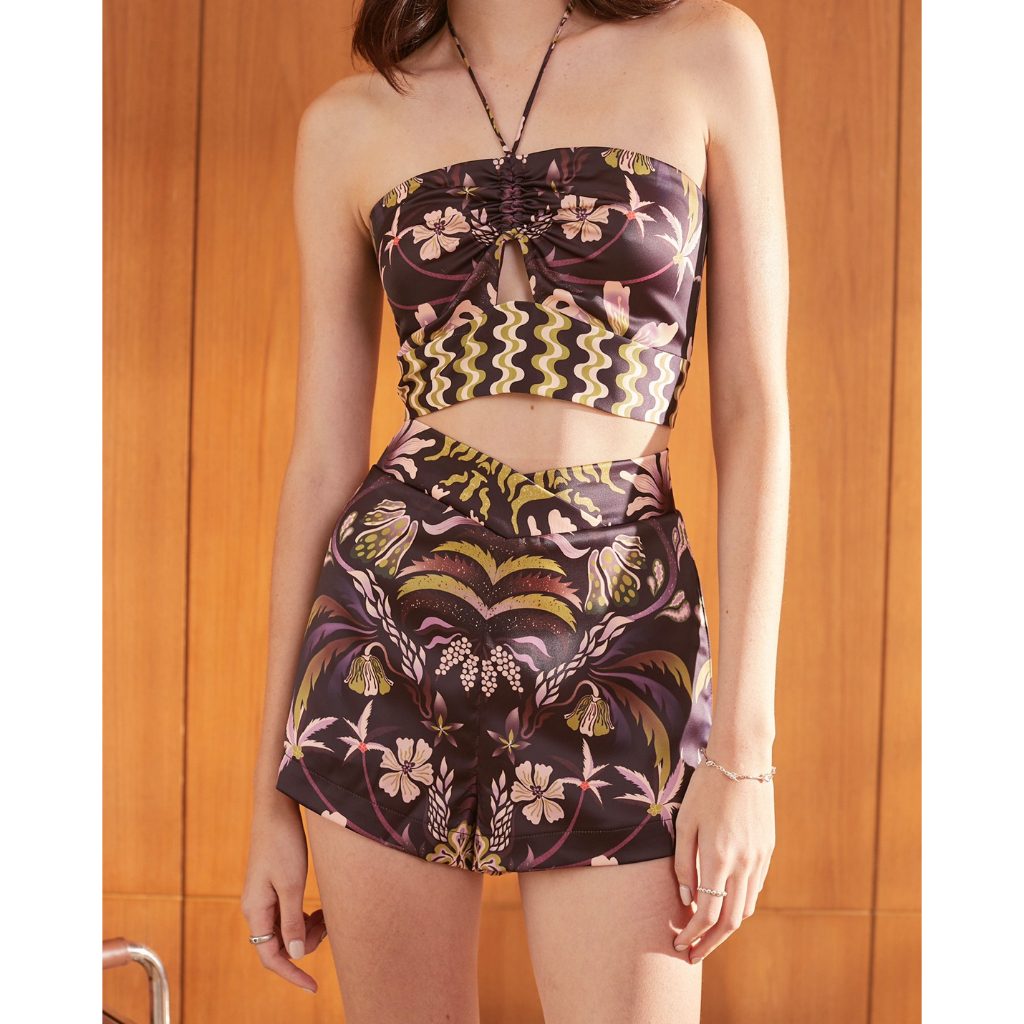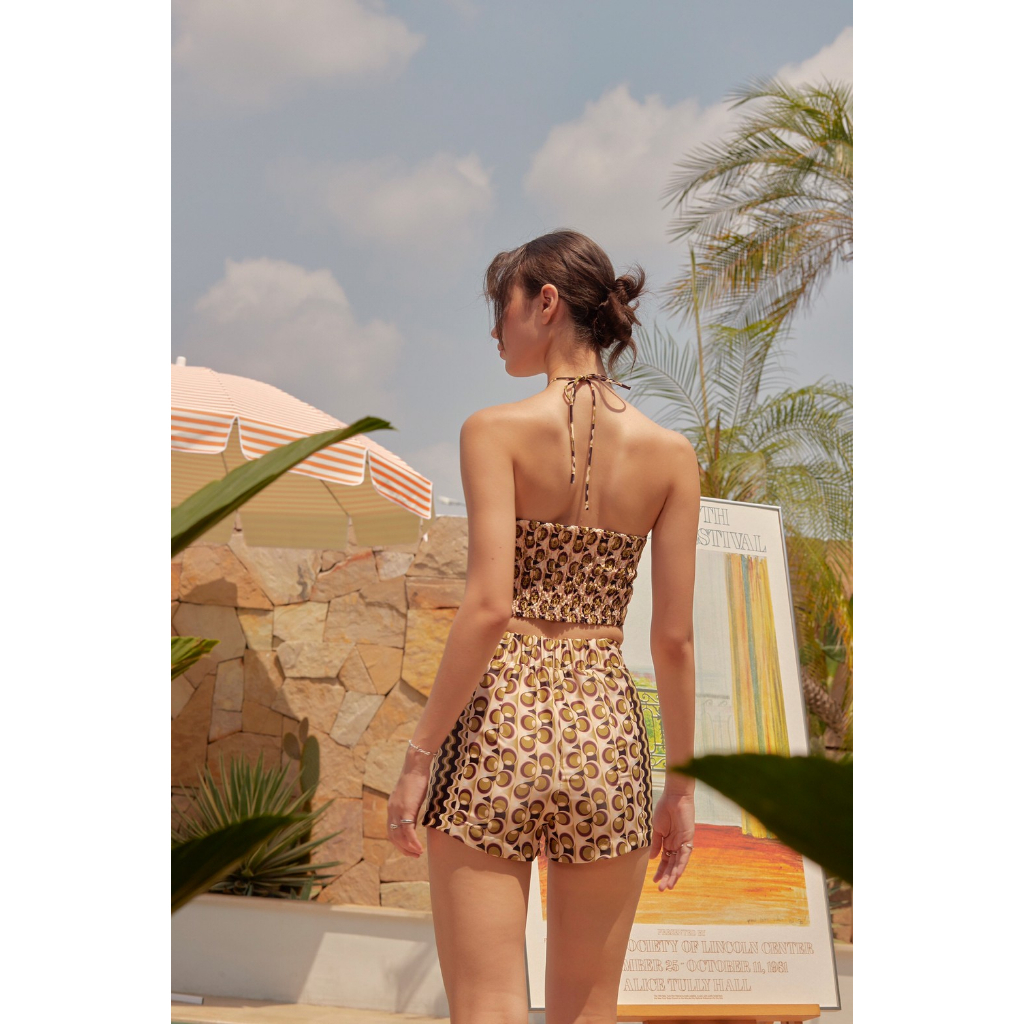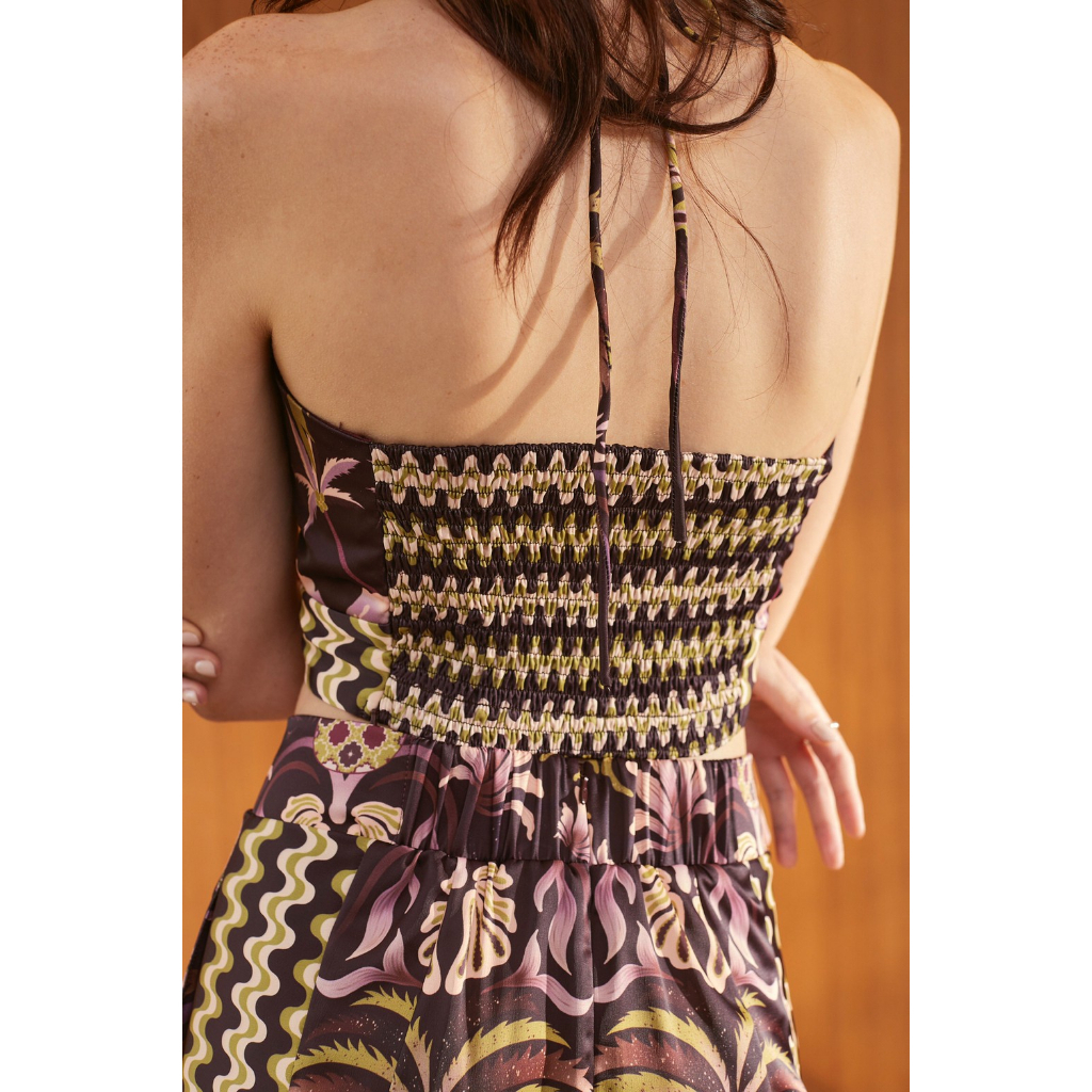 Bandeau-style top with a front ruffle detail and adjustable neck strap. It has a smocked back for a snug fit and features fabric pattern cutting from the Pina collection.