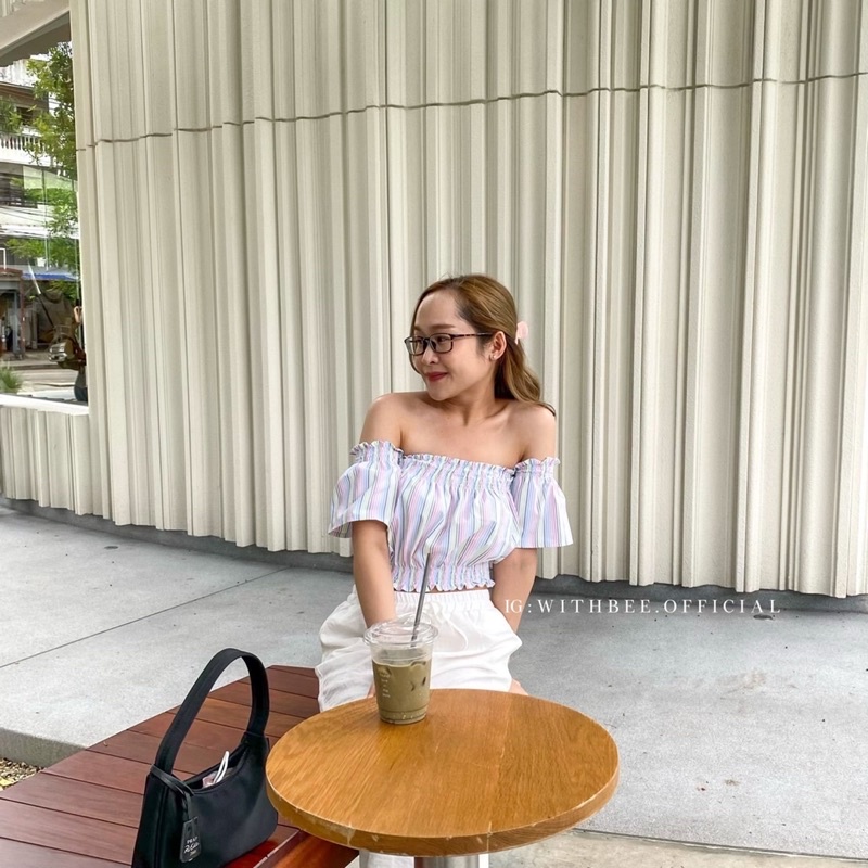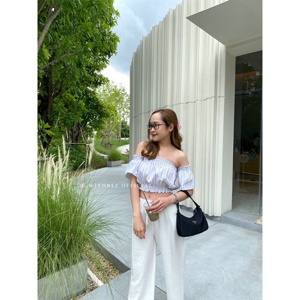 เสื้อครอปปาดไหล่ สีหวานน เนื้อผ้าโพลีเอสเตอร์ 100% ดีเทลจั๊มอก จั้มไหล่ และจั้มเอว เพื่อดูมีมิติเป็นสัดเป็นส่วนใส่แมชกับกางเกงเอวสูง เข้ากันสุดๆ
