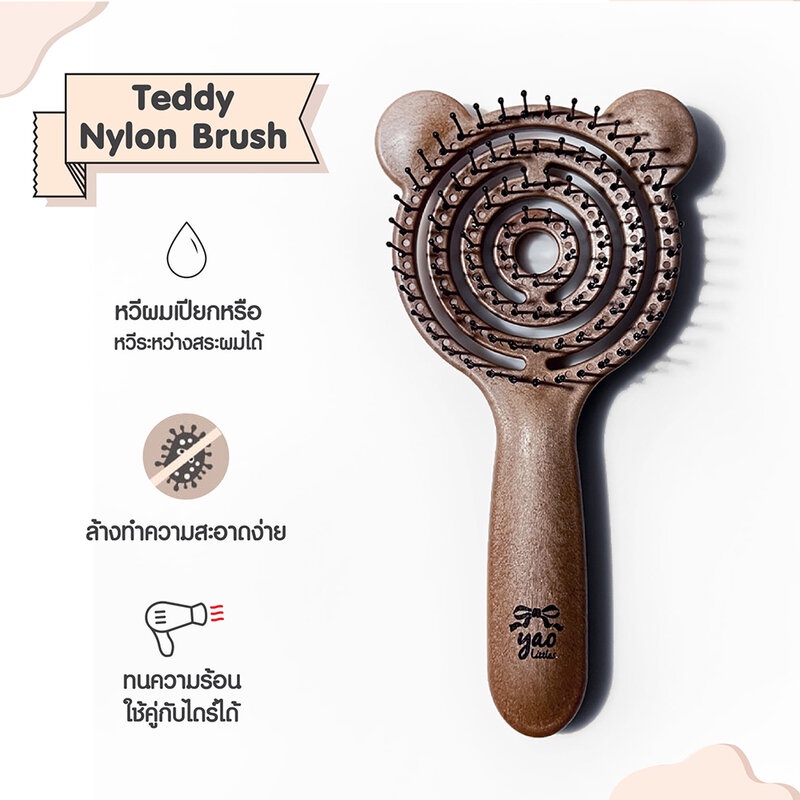 YAO Little Moving Teddy Nylon Brush 85g แปรงหวีผมขนาดเล็ก ดีไซน์น่ารักมีหูหมีน้อย ด้ามจับเล็ก จับถนัดมือทั้งเด็กและผู้ใหญ่ สามารถสางผมพันกันโดยที่ไม่กระชากเส้นผม และไม่ทำให้ผมขาดหลุดร่วง ตัวโครงสร้างสามารถยืดหยุ่นได้ ผสานขนแปรงที่มีความนุ่ม ช่วยให้รู้สึกเหมือนกับการนวดหนังศีรษะในทุกๆ ครั้งที่หวี
