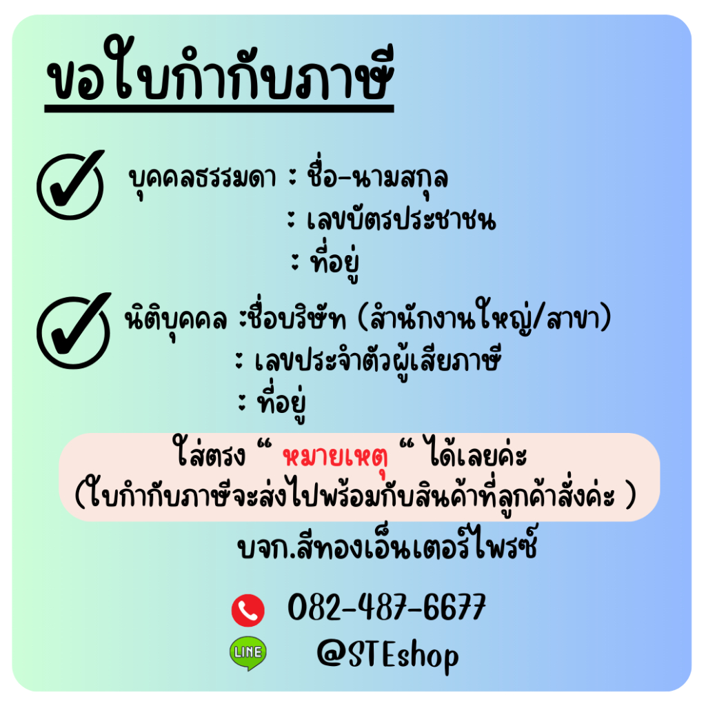 **ส่งชื่อ ที่อยู่ รหัสประจำตัวผู้เสียภาษีมาได้ทางหมายเหตุหรือช่องแชทได้เลยค่ะ**