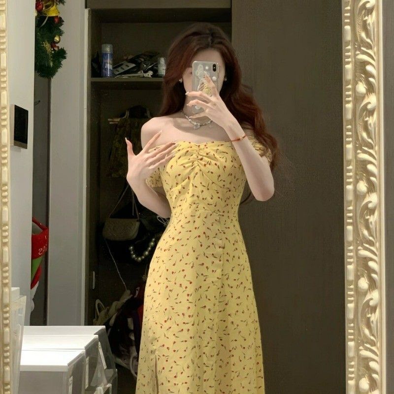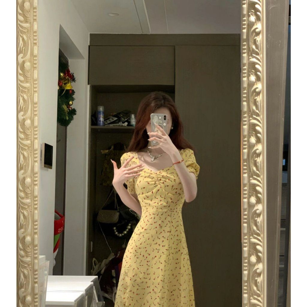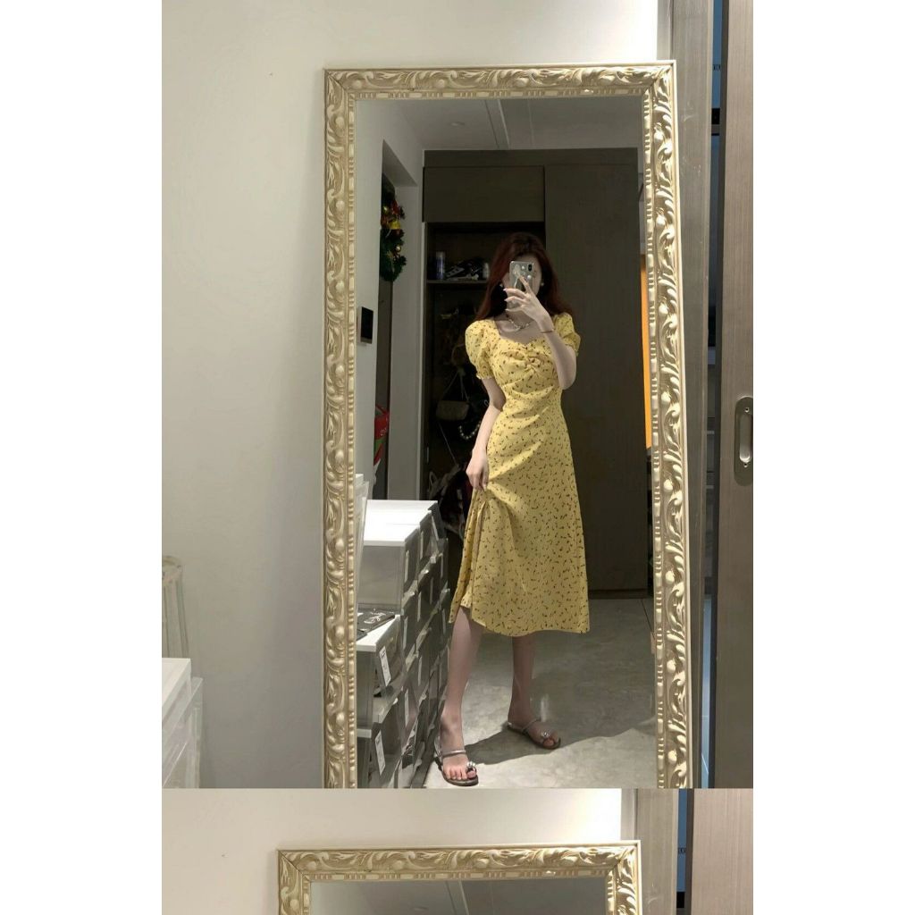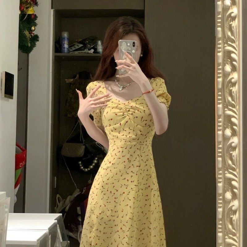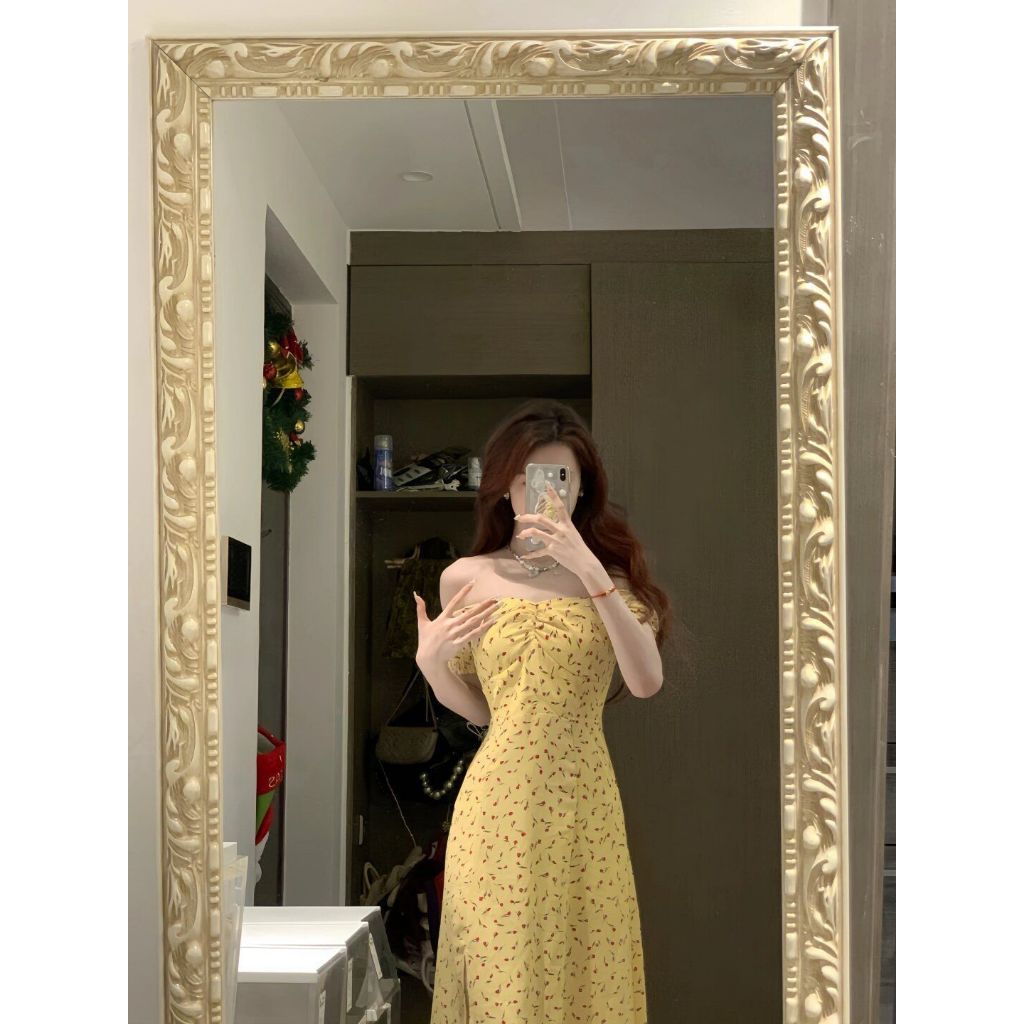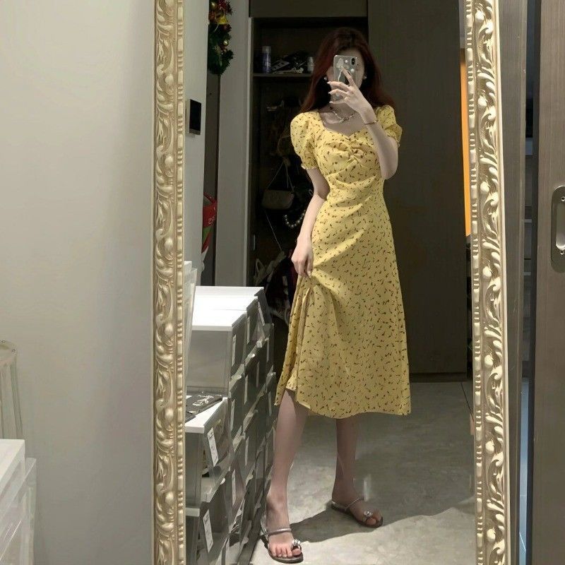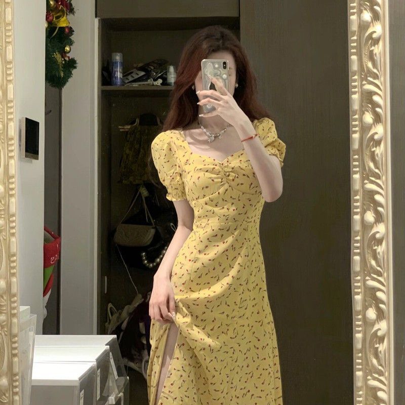 ชุดเดรสคอเหลี่ยมสีเหลืองฝรั่งเศส แขนสั้นผู้หญิง 2026 ฤดูร้อนใหม่ เอวสูง กระโปรงผ่าข้าง กระโปรงยาว