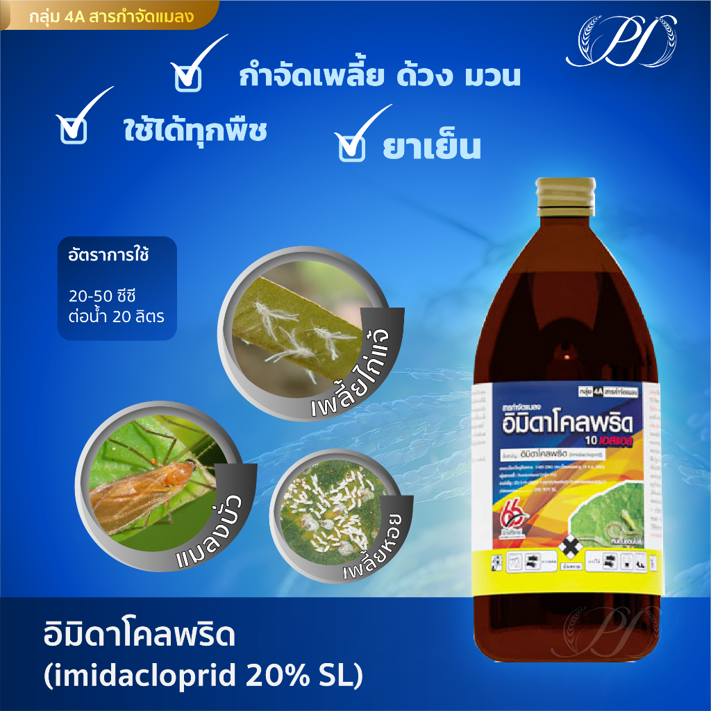 สารป้องกันกำจัดแมลง สารอิมิดาโคลพริด ยาป้องกันกำจัดแมลงชนิดดูดซึม แบบถูกตัวตาย และกินตาย อิมิดาโคลพริด 10 เอสเอล เป็นสูตรน้ำ SL ใช้ง่าย ละลายดี ใช้ป้องกันกำจัด เพลี้ยต่างๆ เช่น เพลี้ยไฟ เพลี้ยไก่แจ้ เพลี้ยจักจั่น เป็นยาเย็น ปลอดภัย สามารถใช้ได้ทุกช่วงการเจริญเติบโตของพืช