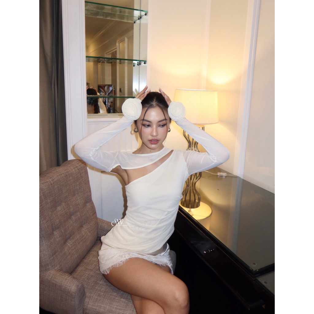 เสื้อซีทรู แขนถอดได้ 1 ข้าง ใส่เป็นไหล่เดียวก็คือเริ่ด ไฮไลท์คือ ดอกโรเซ็ตที่ข้อมือ