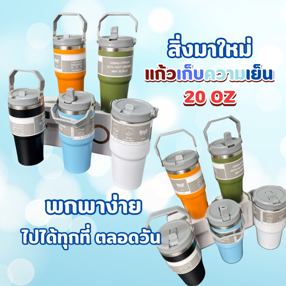 แก้วเก็บความเย็น ฝาหูหิ้ว ขวดน้ํา แก้วขอบเงินทรงสูง แก้วน้ำสแตนเลส 20oz 600ml. สีพื้น แถมฟรีหลอด สแตนเลส304