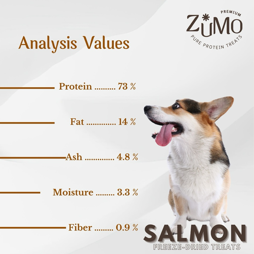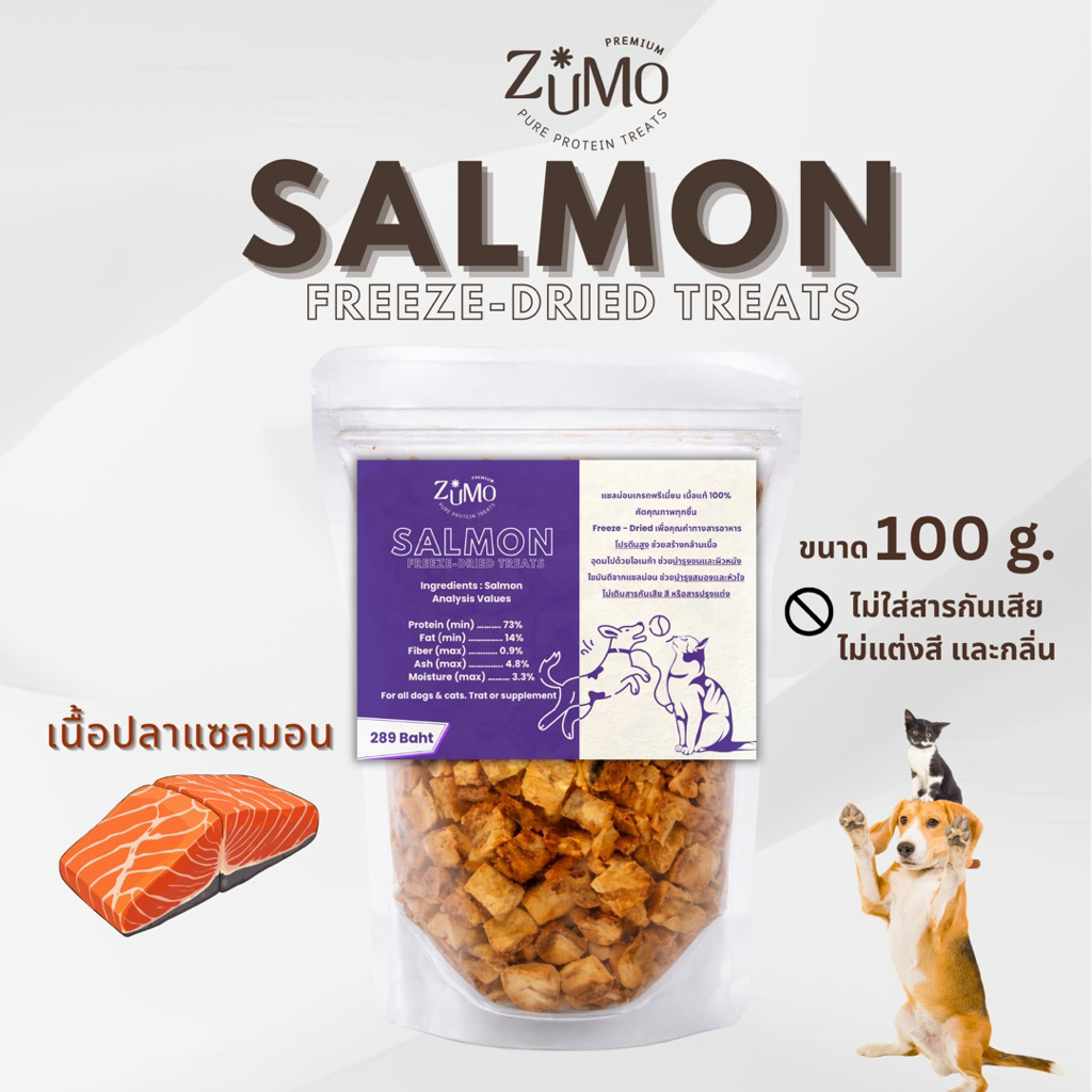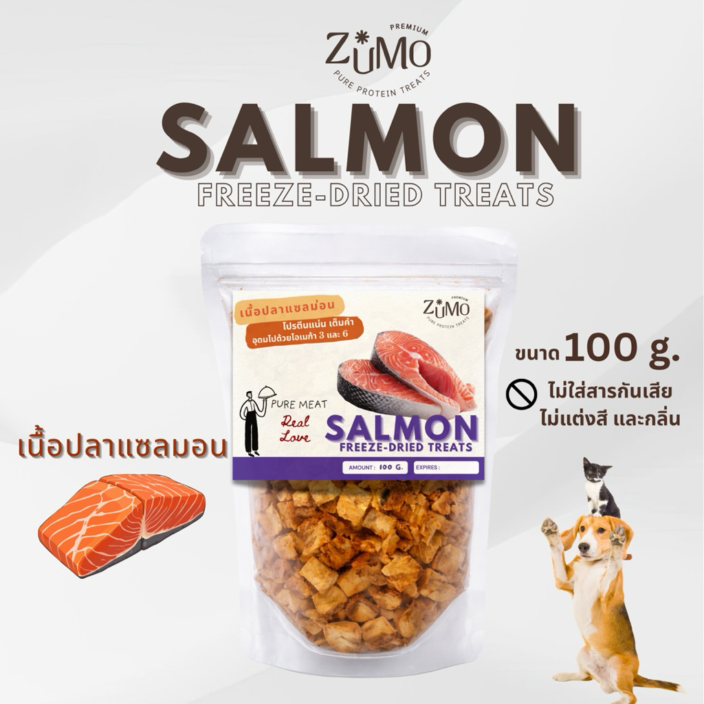 แบรนด์ ZUMO ฟรีซดราย แซลมอน 100 g. เนื้อปลาแซลม่อน 100% เต็มคำ ไม่ผสมเกลือ Salmon Freeze dried ขนมแมว ขนมสุนัข
