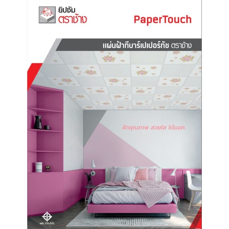แผ่นฝ้ายิปซัมทีบาร์ เปเปอร์ทัช ตราช้าง ผิวหน้าเป็นกระดาษเคลือบพิเศษ สามารถเช็ดทำความสะอาดได้ง่าย มีลวดลายและสีสันสดใส สวยงาม ผลิตจากแผ่นยิปซัมที่ได้มาตรฐานผลิตภัณฑ์อุตสาหกรรม มอก219-2552 จึงมั่นใจได้ว่า แผ่นฝ้าทีบาร์เปเปอร์ทัช ตราช้าง มีคุณภาพดีสม่ำเสมอ ไม่แอ่นตัว แข็งแรง และความได้ฉากของแผ่นทำให้ติดตั้งได้ง่าย ใช้งานได้ยาวนาน คุ้มค่า มีให้เลือก 2 รุ่นคือ รุ่นมาตรฐานและรุ่นฮีทบล็อค