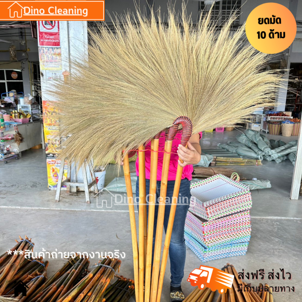 ไม้กวาดดอกหญ้า รุ่นโค้งใหญ่ ยกมัด 10 ด้าม ถักเชือกแน่นหนา ด้ามยาว