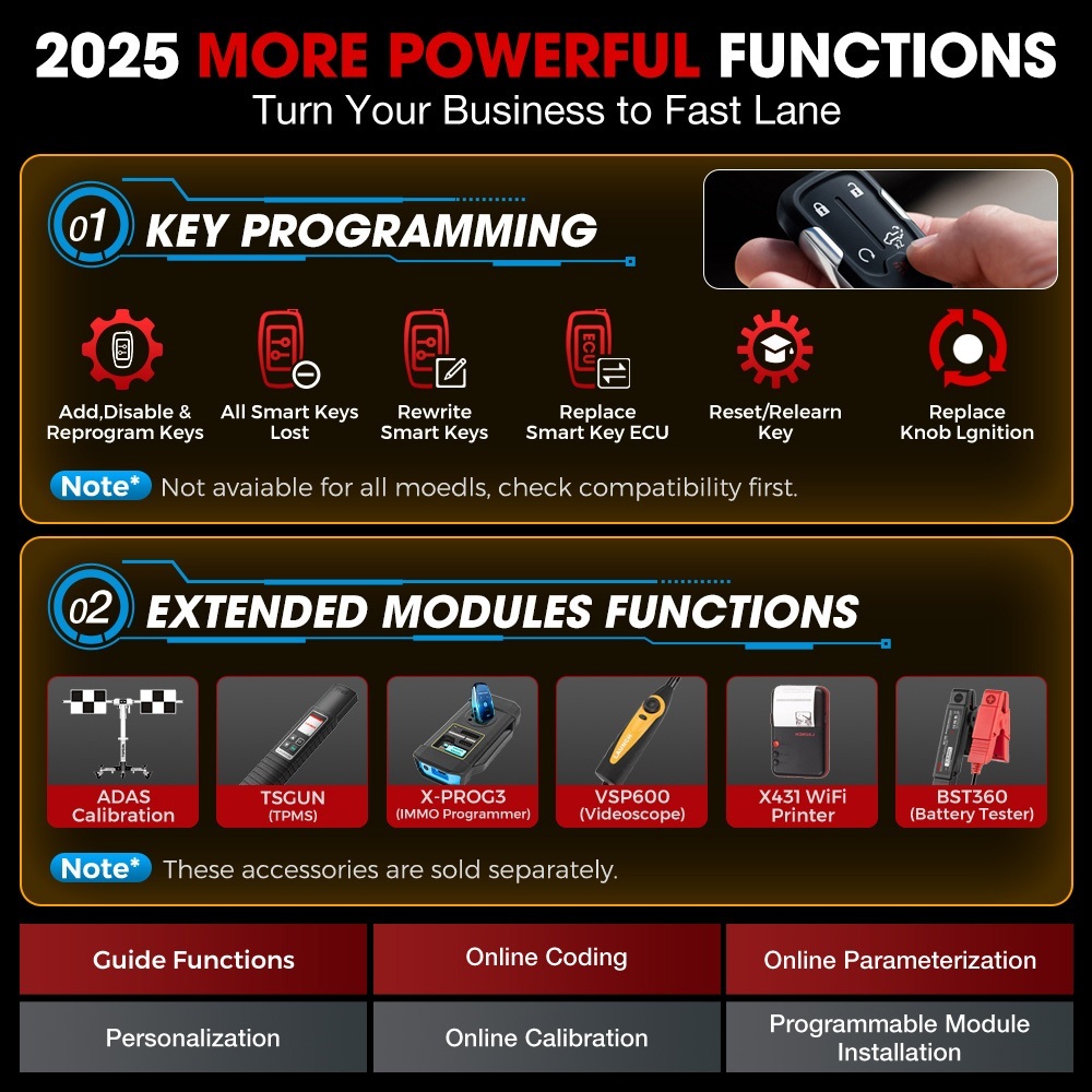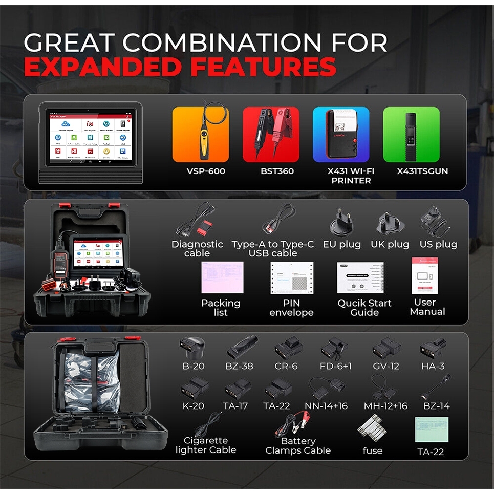 (11) Add-on Modules to Achieve Double efficiency:All are sold separately to meet your various needs: ADAS Tool Kit to assist ADAS calibration; VSP-600 VideoScope to check unseen parts of the engine, fuel tank, braking system, etc.; S2-2 SensorBox to simulate vehicle sensor faults; O2-1 ScopeBox Oscilloscope to quickly acquire circuit signals; X431 Printer to print out diagnostic reports; X431 TSGUN to activate all 315/433MHz sensors, relearn & program LAUNCH sensors; BTS360 Battery Tester to get a thorough battery test; X-PROG & X-PROG3 Immobilizer to turn this tpms programming tool into a locksmith-level IMMO service tool.