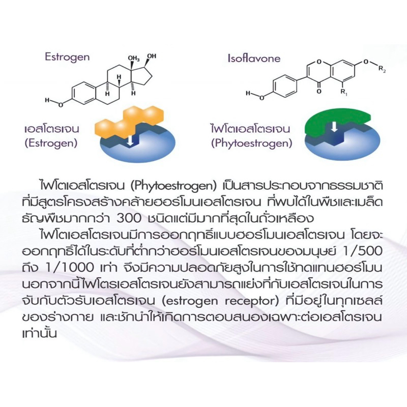 🔸ไฟโตเอสโตรเจน (Phytoestrogen) เป็นสารประกอบจากธรรมชาติ ที่มีสูตรโครงสร้างคล้ายฮอร์โมนเอสโตรเจน ที่พบได้ในพืชและเมล็ด ธัญพืชมากกว่า 300 ชนิดแต่มีมากที่สุดในถั่วเหลือง ไฟโตเอสโตรเจนมีการออกฤทธิ์แบบฮอร์โมนเอสโตรเจน โดยจะ ออกฤทธิ์ได้ในระดับที่ต่ำกว่าฮอร์โมนเอสโตรเจนของมนุษย์ 1/500 ถึง 1/1000 เท่า จึงมีความปลอดภัยสูงในการใช้ทดแทนฮอร์โมน นอกจากนี้ไฟโตรเอสโตรเจนยังสามารถแย่งที่กับเอสโตรเจนในการ จับกับตัวรับเอสโตรเจน (estrogen receptor) ที่มีอยู่ในทุกเซลล์ ของร่างกาย และชักนำให้เกิดการตอบสนองเฉพาะต่อเอสโตรเจน เท่านั้น