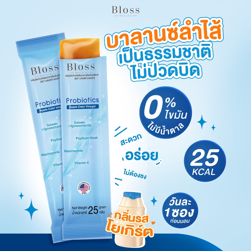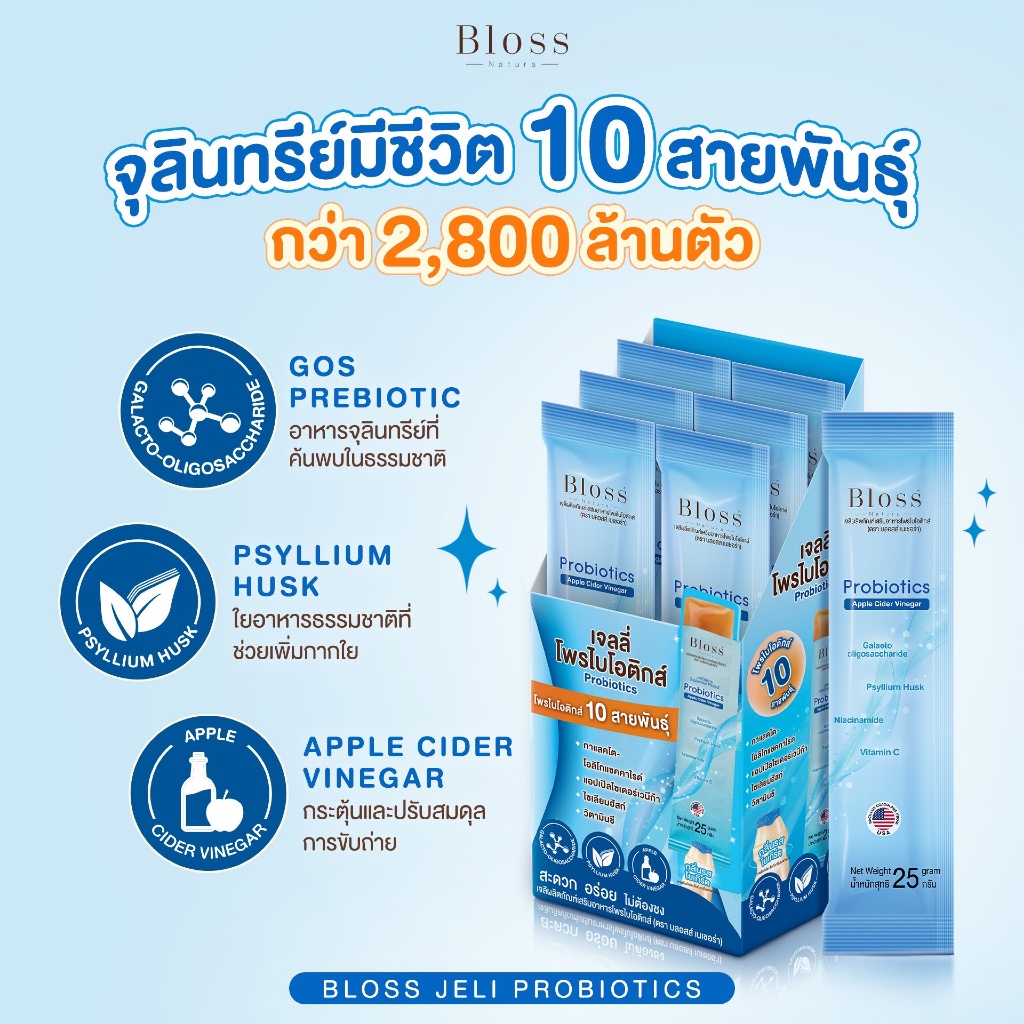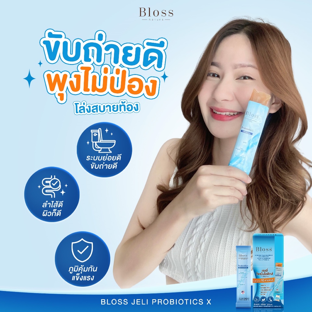 Bloss Probiotics x ใหม่ล่าสุดจากบอสส์ สูตรซินไบโอติกส์ (Synbiotics) ให้คุณมีความสุขกับการเติมจุลินทรีย์ดีๆ ให้ลำไส้ได้ง่ายๆ ทุกวันกับบลอสส์เจลลี่ที่ใช้ Active Gel Technology เทคโนโลยีการผลิตอาหารของนักบินอวกาศที่ดูดซึมได้ดี คงสารอาหารไม่ให้เสื่อมคลาย รสชาติอร่อย ทานง่าย ได้ประโยชน์เต็มทุกคำจาก Probiotics จุลินทรีย์ที่มีชีวิต จากประเทศสหรัฐอเมริกาผ่านการทดสอบประสิทธิภาพและความปลอดภัยสามารถทนต่ออุณหภูมิสูงและสภาวะกรดในกระเพาะอาหารได้ ช่วยสร้างสมดุลจุลินทรีย์ธรรมชาติในลำไส้ของคุณได้ในทุกๆ วัน