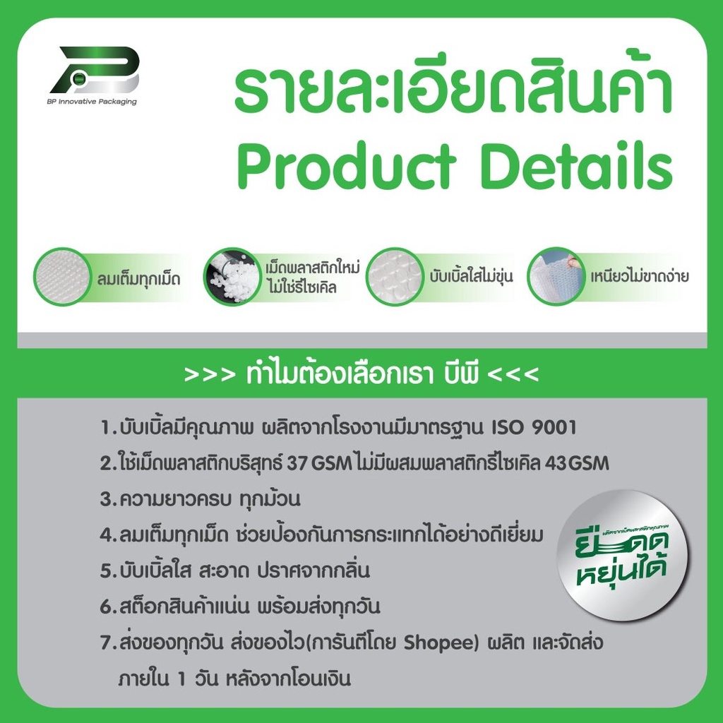 พลาสติกกันกระแทก BP Packaging มีมาตรฐาน ISO 9001 ผลิตจากเม็ดพลาสติกบริสุทธ์ 37 GSM (ไม่มีผสมพลาสติกรีไซเคิล 43 GSM) เหนียว ทน ไม่ขาดง่าย ใส สะอาด ปราศจากกลิ่น,ความยาวครบทุกม้วน,ลมเต็มทุกเม็ด ยืดหยุ่นได้ สามารถรองรับแรงกระแทกได้อย่างมั่นใจ สามารถตัดให้พอดีกับสินค้าได้ จะห่อหุ้มเพื่อการเก็บของ หรือกันการกระแทกจากการขนส่ง