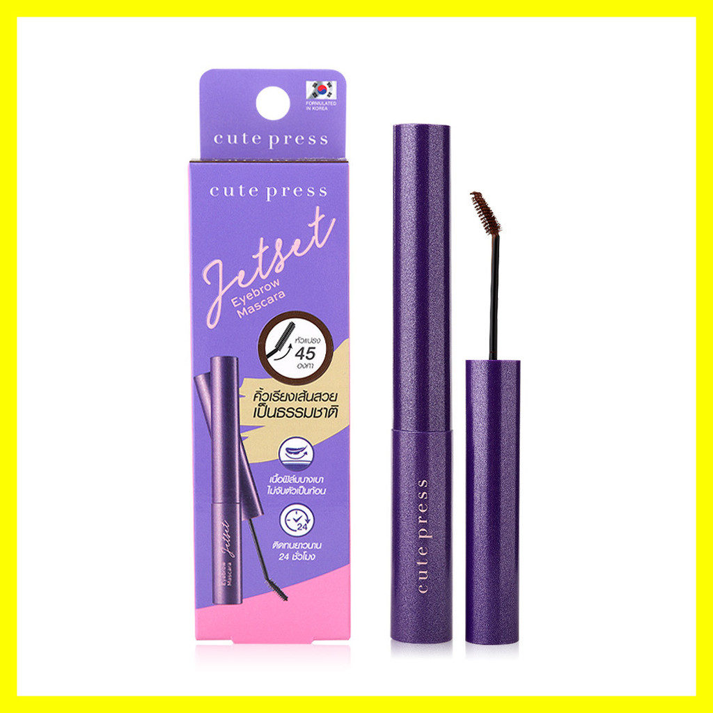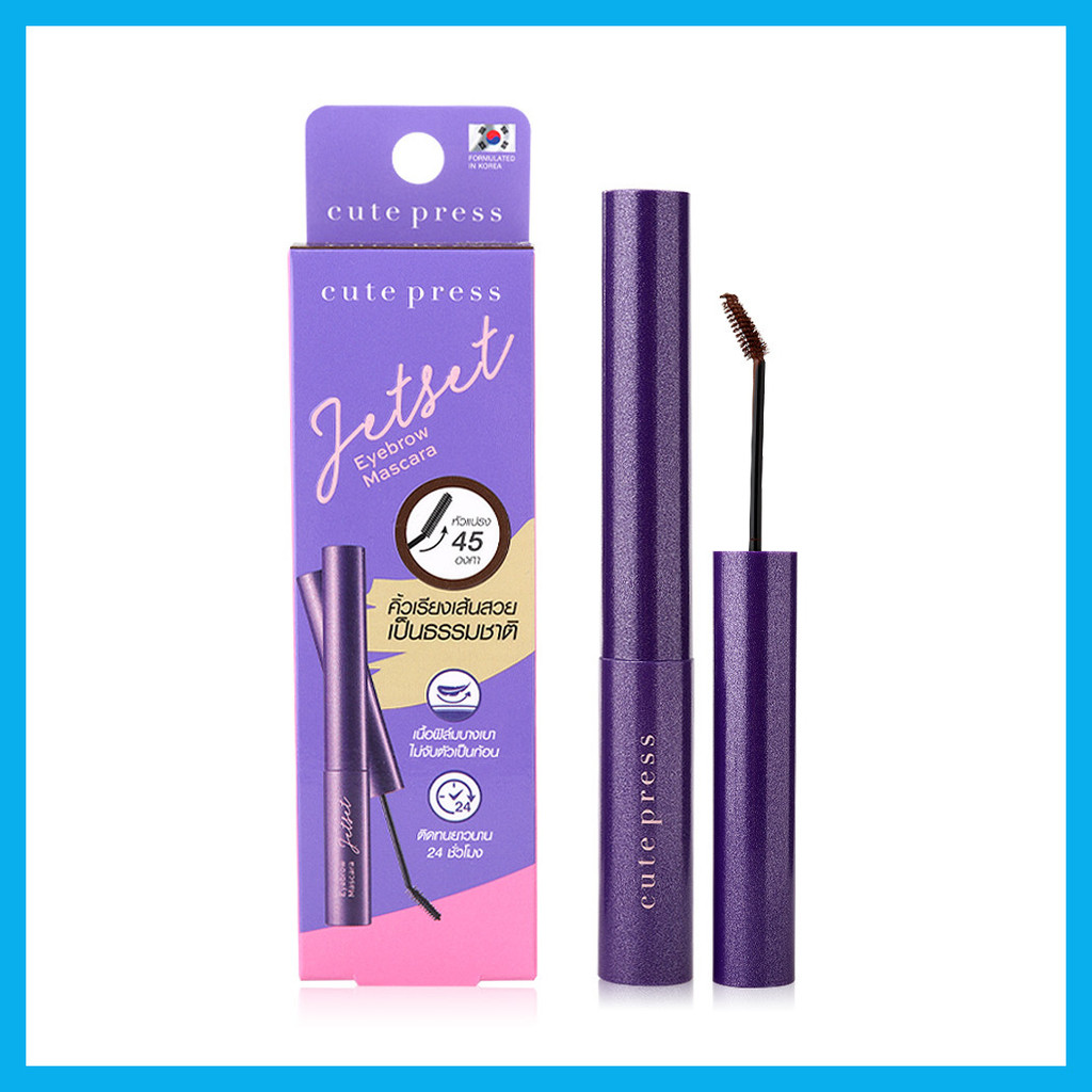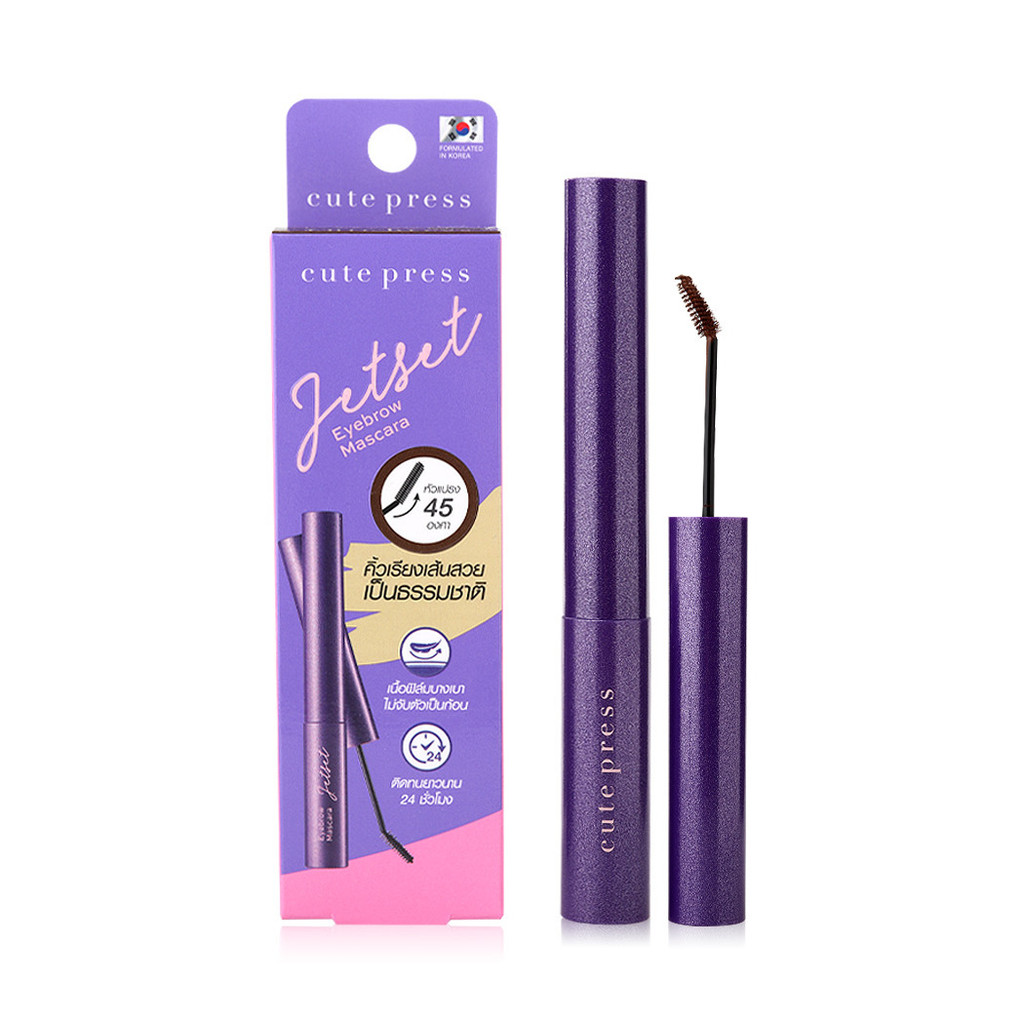 Cute Press Jet Set Eyebrow Mascara 4.5g มาสคาร่าสำหรับปัดขนคิ้ว เนื้อฟิล์มบางเบาไม่จับตัวเป็นก้อน มาพร้อมกับหัวแปรง 45 องศา ปัดง่ายทุกเส้น รับกับทุกมุมคิ้ว เนรมิตให้คิ้วเรียงเส้นสวยเป็นธรรมชาติ สีชัดติดทนนาน 12 ชั่วโมง