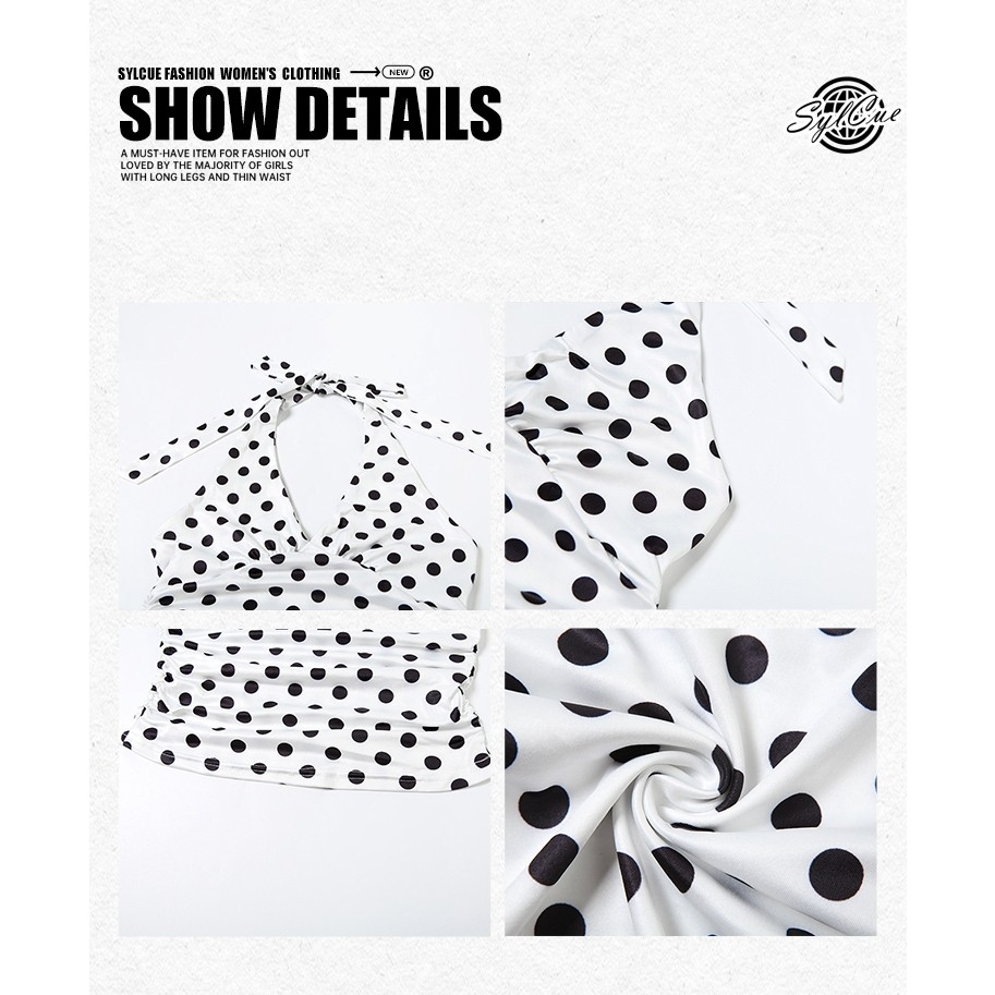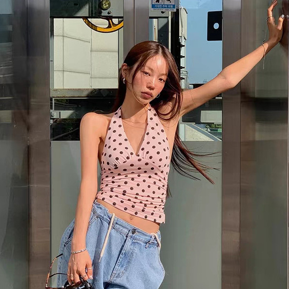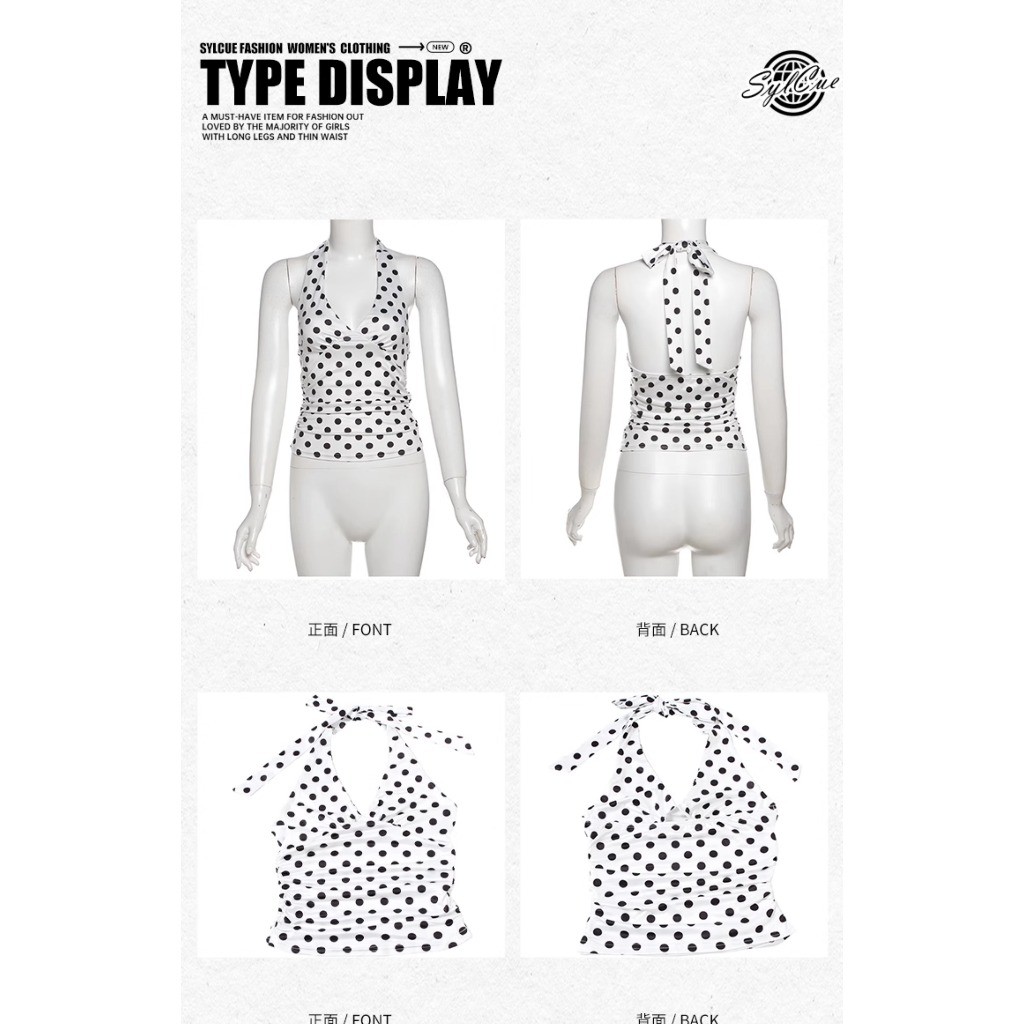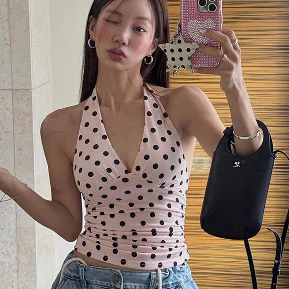 Elly พร้อมส่ง🎀ลายโพกาดอท เสื้อคล้องคอ เสื้อครอป และเปิดหลัง คอวีลึก เซ็กซี่แฟชั่นผู้หญิง ผูกคอ ดูแพง ทรงเข้ารูป จับจีบ