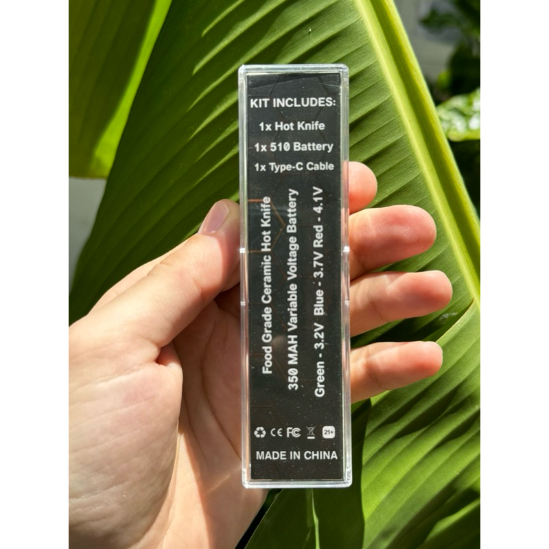 Hot knife Dabber tool is an electric heated cutting and loading tool, also known as an Electric Dabber. The heat component makes the handling of stickier concentrates more seamless. The Hot Knife Blade's tip is constructed of high quality food grade ceramic, and features an adjustable heating element that will not burn or overheat your wax materials. The ceramic tip is nicknamed the Blade, because of its perfect cutting structure and its ability to slash through all different types of concentrates regardless of consistency. The battery paired with the Blade, as previously mentioned, is variable voltage, offering multiple temperature settings for cutting, loading, maneuvering, and separating even the thickest of wax materials. The Hot Knife is fully equipped with a 350mAh battery, preheat capabilities, a Type C charger, and a Food grade Ceramic Tip. Because of its high quality battery and adjustable voltage this nifty yet innovative device is sure to keep up with multiple back to back sessions without dying.