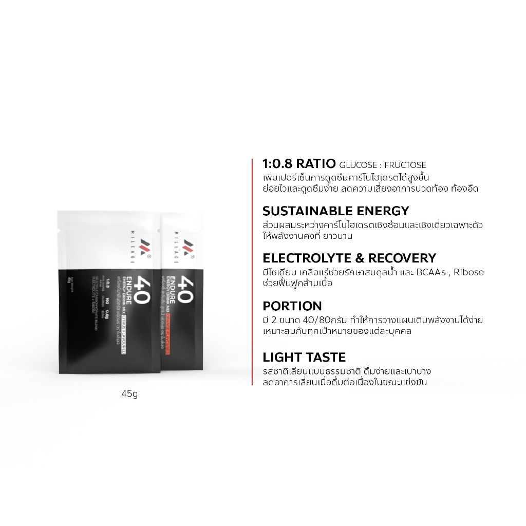 40 คือเลขที่อธิบายปริมาณคาร์โบไฮเดรตจำนวน 40 กรัม เพื่อให้นักกีฬาเข้าใจง่ายและวางแผนการเติมพลังงานได้อย่างเหมาะสม ซองขนาด 7.5x13ซม น้ำหนักสุทธิซองละ 45กรัม (ซองเล็ก)