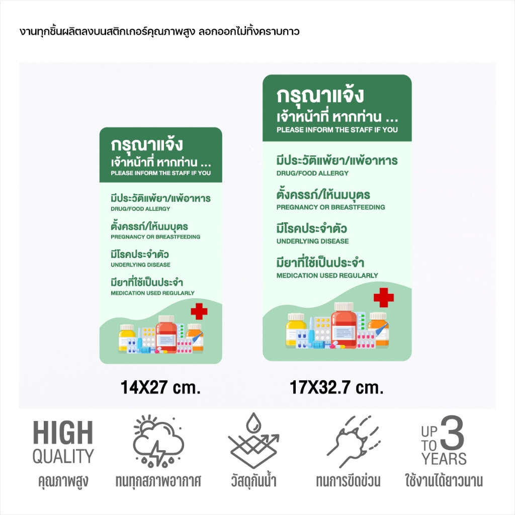 (N027) สติกเกอร์ กรุณาแจ้งเจ้าหน้าที่หากท่านแพ้ยา ป้ายแจ้งการแพ้ยา ร้านยา-คลินิก สติกเกอร์ PVC 3M กันน้ำ งานพิมพ์คุณภาพ