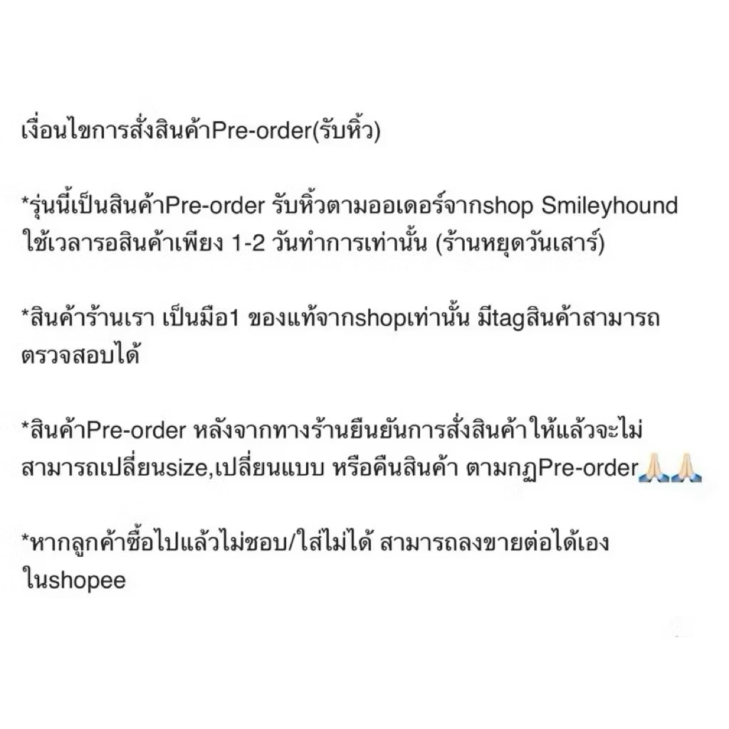 *สินค้าPre-order หลังจากทางร้านยืนยันการสั่งสินค้าให้แล้วจะไม่สามารถเปลี่ยนsize,เปลี่ยนแบบ หรือคืนสินค้า ตามกฏPre-order🙏🏻🙏🏻
