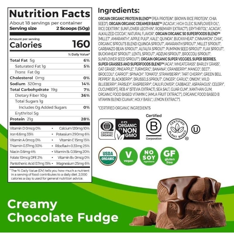 โปรตีนมังสวิรัติออร์แกนิก + 50 ผงซุปเปอร์ฟู้ด - โปรตีนจากพืช 21 กรัม, ไฟเบอร์พรีไบโอติก 8 กรัม, ไม่มีส่วนผสมแลคโตส, ไม่มีกลูเตน, ไม่มีน้ำตาลเพิ่ม, ไม่มีจีเอ็มโอ, 2.02 ปอนด์