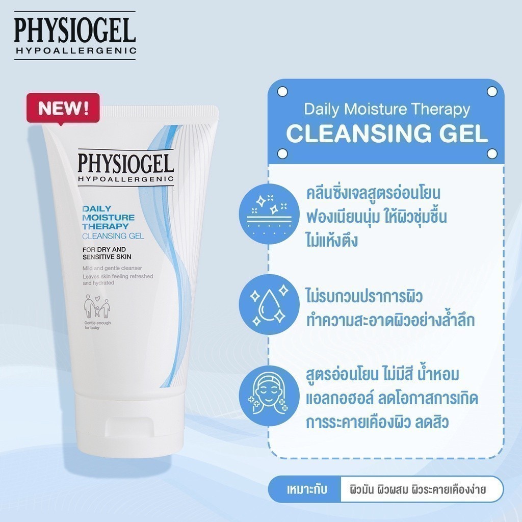 PHYSIOGEL Daily Moisture Therapy Cleansing Gel พร้อม Bio-Mimic Technology ที่เลียนแบบโครงสร้างชั้นไขมันที่จำเป็นในผิว ทำให้อ่อนโยนต่อผิว ไม่รบกวนเกราะปกป้องผิว พร้อมเติมน้ำให้ผิว ช่วยล้างเครื่องสำอาง ขจัดสิ่งสกปรกอย่างหมดจด และลดความมันส่วนเกินบนผิวชั้นนอกสุดอย่างเห็นได้ชัด โดยไม่ทำให้ผิวแห้ง พร้อมทั้งทำให้ผิวอ่อนนุ่ม และกักเก็บความชุ่มชื่นของน้ำในผิว ไม่มีส่วนผสมของสบู่ ไม่มีแอลกอฮอล์ ไม่มีน้ำหอมและไม่มีสี เหมาะสำหรับผิวบอบบาง ชำระล้างความมันบนใบหน้าอย่างหมดจดโดยไม่ทำให้ผิวแห้งหยาบกร้าน เป็นสูตรอ่อนโยน ใช้ได้แม้ผิวที่ผ่านการใช้ยารักษาผิวหน้า ,ผิวบอบบางแพ้ง่าย และผิวเด็ก เจลล้างหน้าชนิดมีฟอง สูตร Soap-free, Alcohol-free, Preservative-free, pH 6.0-6.5 ช่วยปรับสมดุลของผิว ทำความสะอาดผิวหน้าอย่างอ่อนโยน สะอาดหมดจด ขจัดสิ่งสกปรกและ คุมความมัน มอบผิวที่สะอาด แลดูกระจ่างใส ผลลัพธ์ที่ได้หลังใช้ จะทำให้ผิวรู้สึกมีความชุ่มชื่นขึ้นทันทีหลังใช้ สบายผิว ทำให้ผิวแลดูอิ่มน้ำ และสุขภาพดี และเมื่อใช้ต่อเนื่อง ช่วยฟื้นบำรุงผิวแห้งขาดน้ำให้แข็งแรงขึ้น และชุ่มชื่นยาวนาน 72 ชม. แนะนำวีธีใช้ ให้ใช้ล้างหน้าด้วยน้ำอุ่นเพื่อลดการอุดตันของรูขุมขน วอร์มเนื้อผลิตภัณฑ์บนฝ่ามือจนเกิดฟอง จากนั้นนวดผลิตภัณฑ์ลงบนผิวหน้ำให้ทั่ว โดยเน้นบริเวณทีโซนและลำคออย่างเบามือ โดยการนวดผิวรอบๆ เป็นวงกลม ล้ำงออกด้วยน้ำเย็นเพื่อกระชับรูขุมขน ควรใช้เป็นประจำทุกเช้า และ/หรือ เย็น