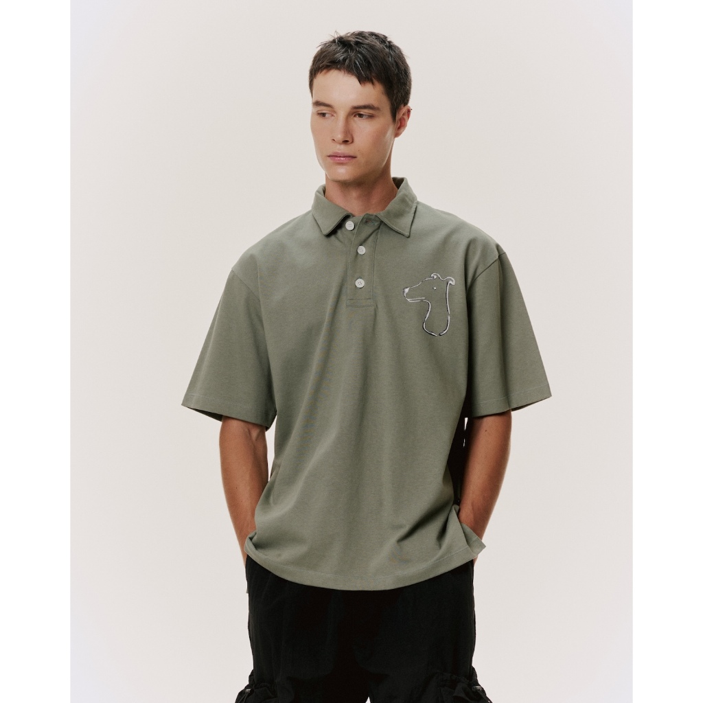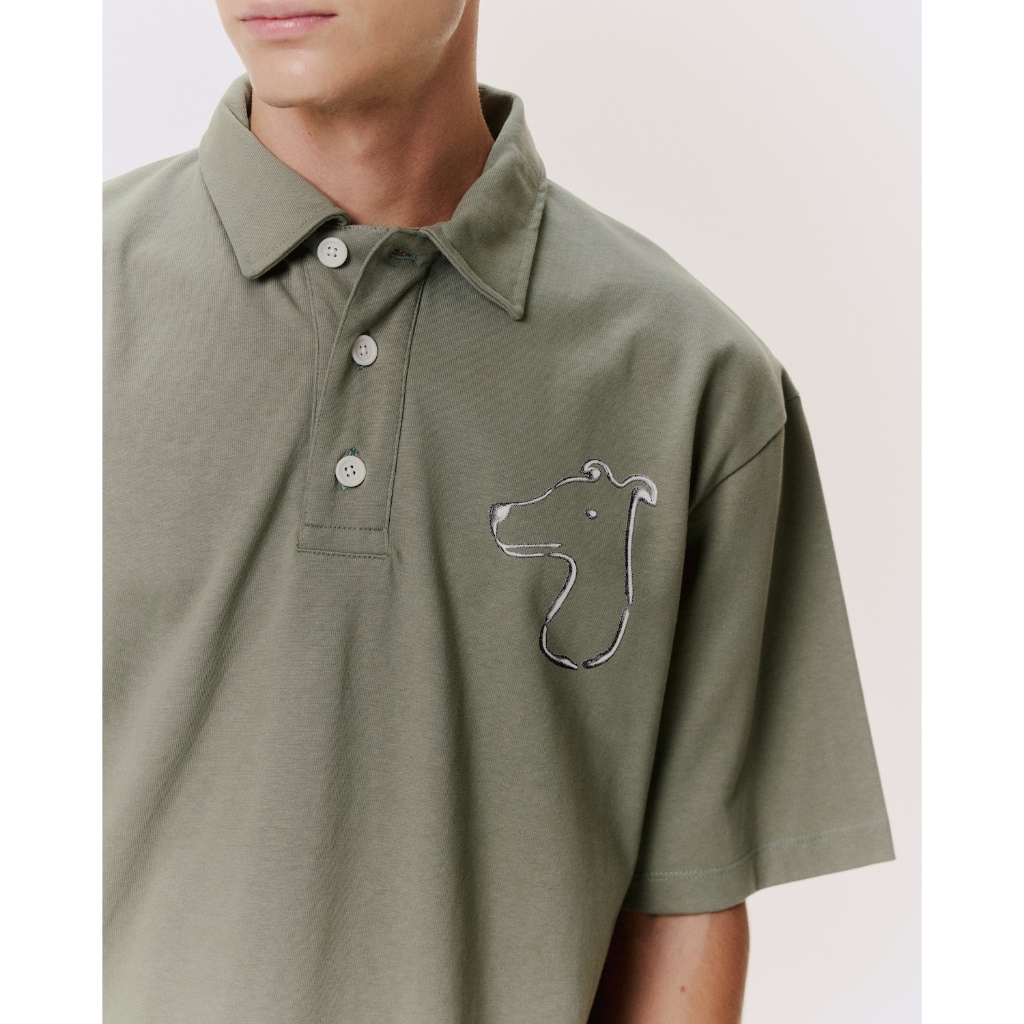 • Large embroidered dog icon on the chest
