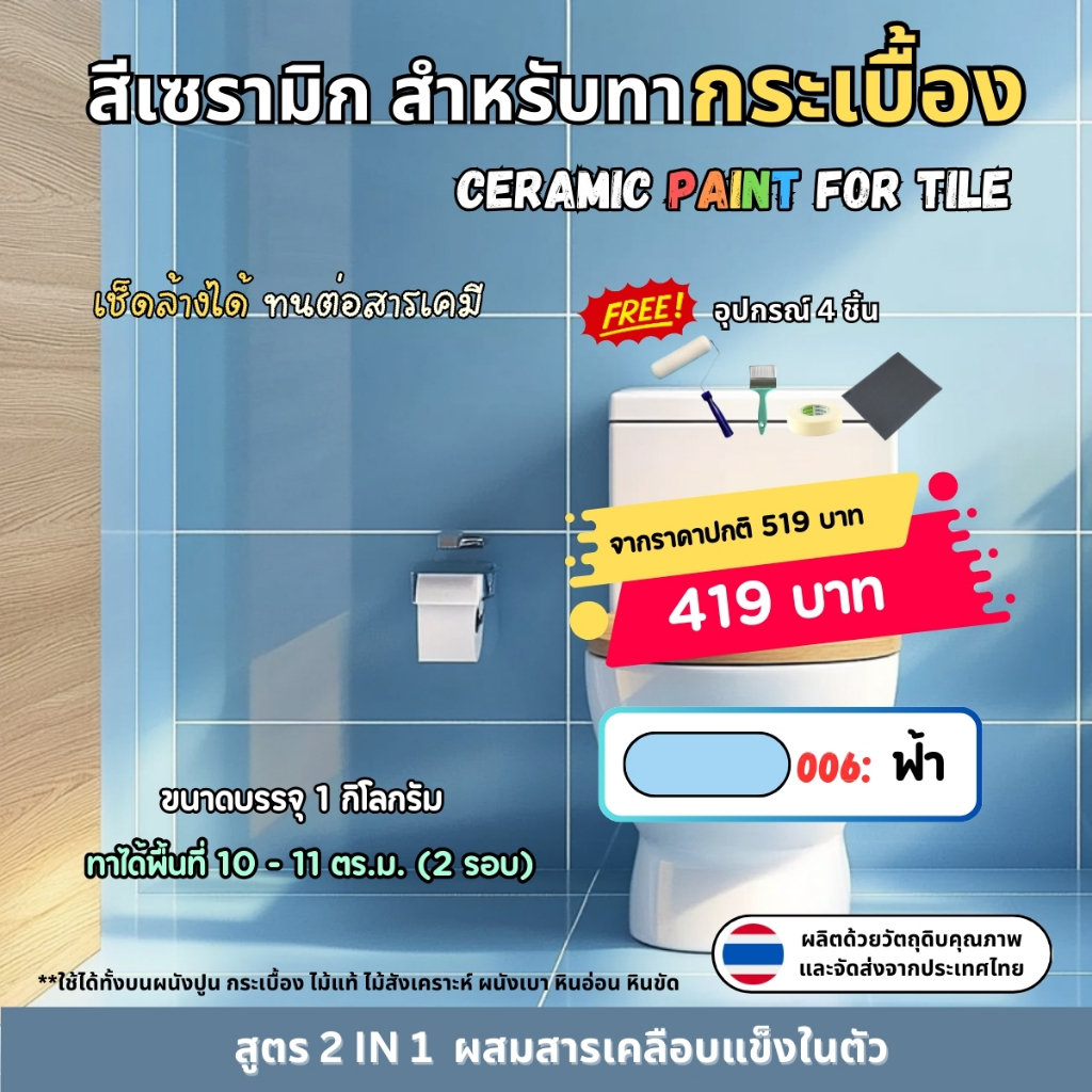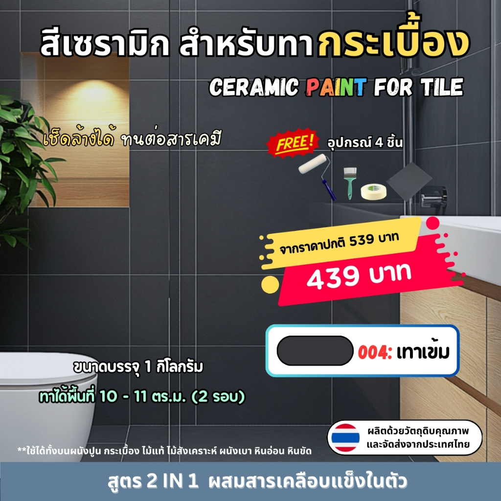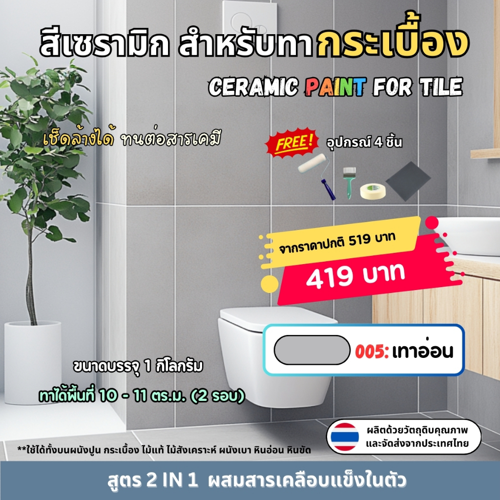 🎁 แถมฟรีอุปกรณ์ทาสี 4 ชิ้น (ลูกกลิ้ง 4 นิ้ว, แปรงทาสี, กระดาษทราย, เทปกาวย่น)