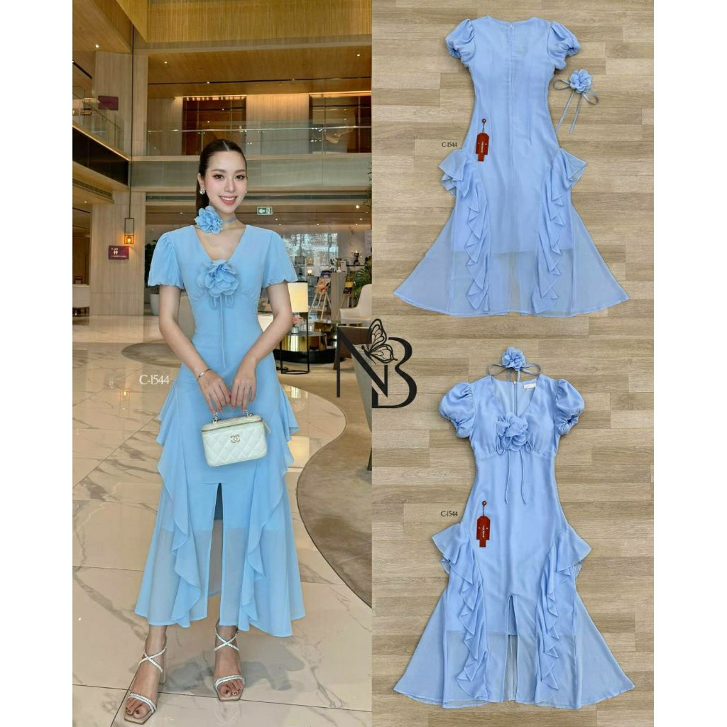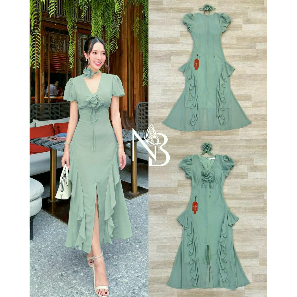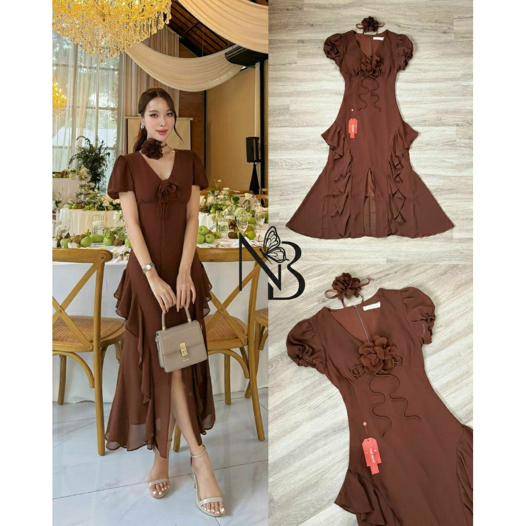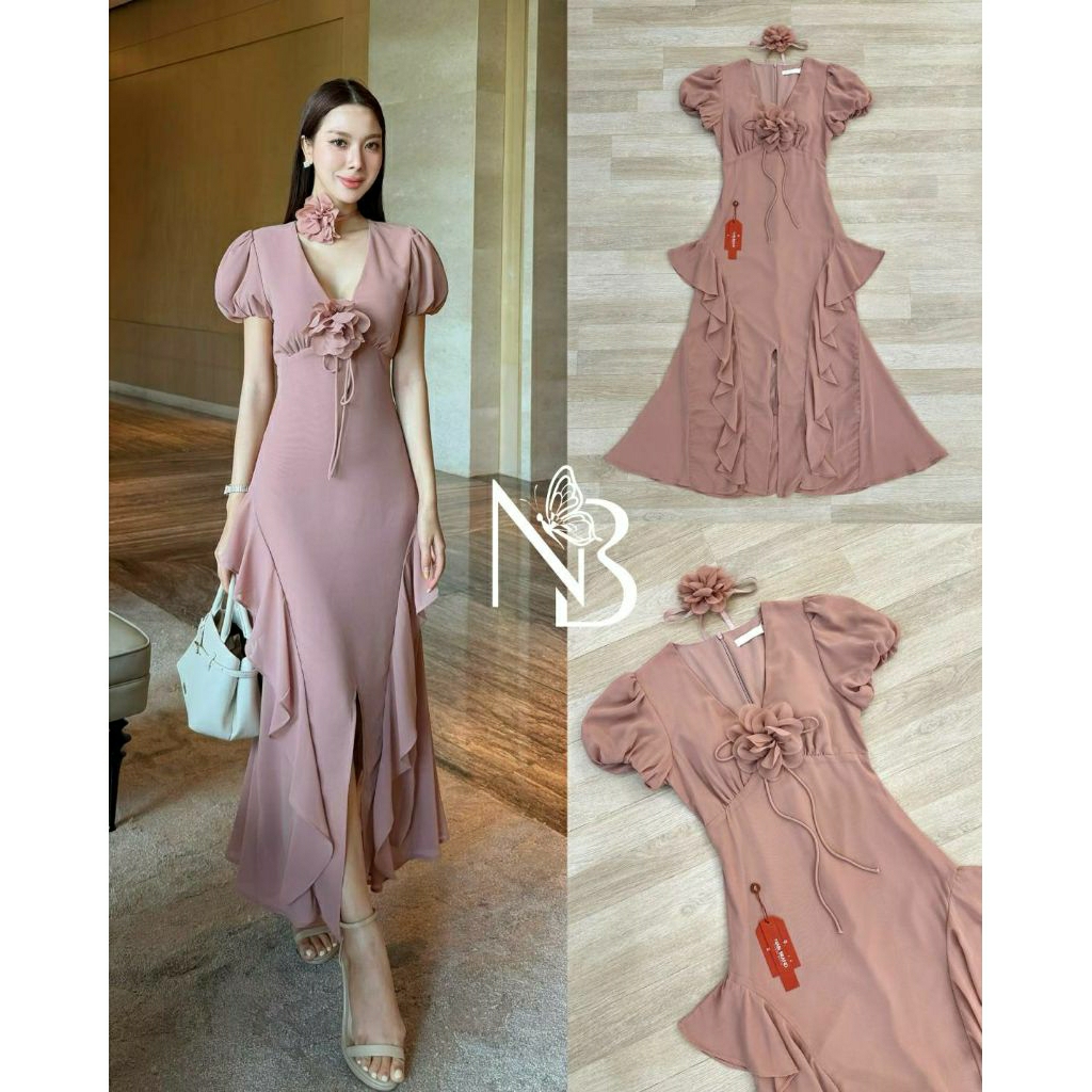 ( S-XL) NABI 📣พร้อมส่งเดรสแขนสั้นทรงคอวี+สายผูกโบว์ติดดอกไม้เข็มกลัด+ดอกไม้โช๊คเกอร์กระโปรงแต่งหางปลาชุดใส่ออกงาน
