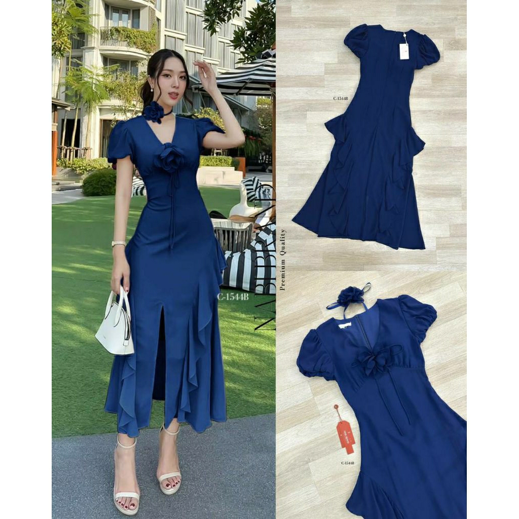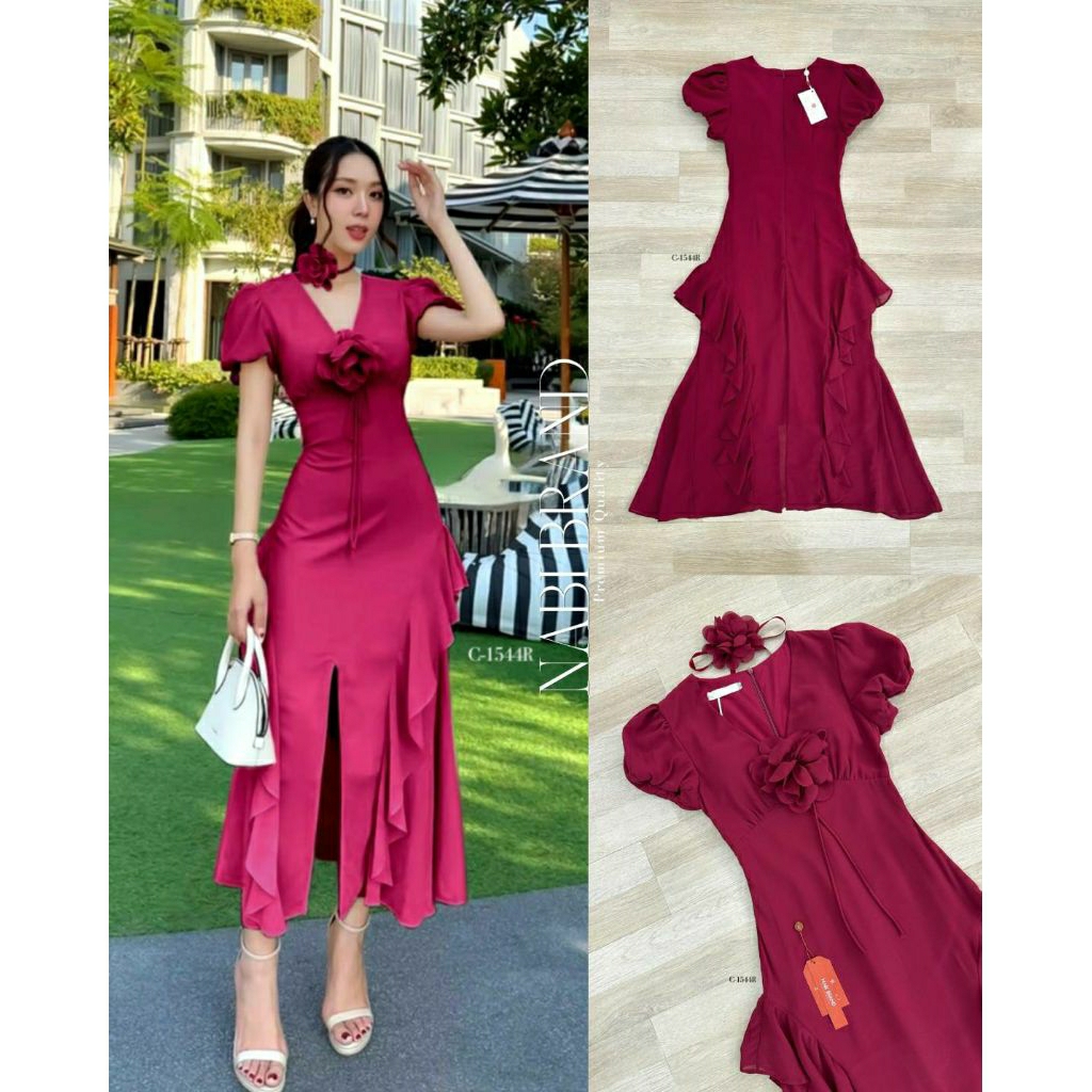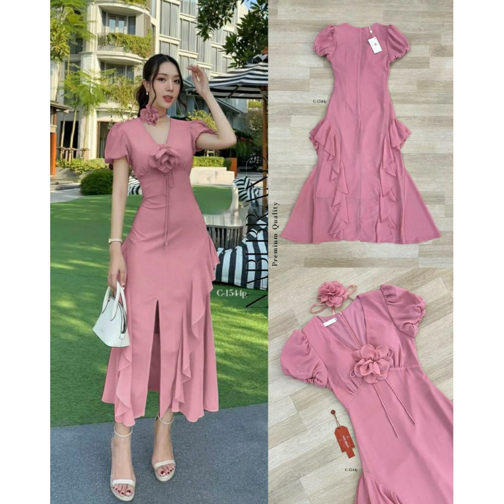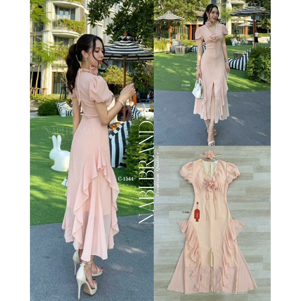 ( S-XL) NABI 📣พร้อมส่งเดรสแขนสั้นทรงคอวี+สายผูกโบว์ติดดอกไม้เข็มกลัด+ดอกไม้โช๊คเกอร์กระโปรงแต่งหางปลาชุดใส่ออกงาน