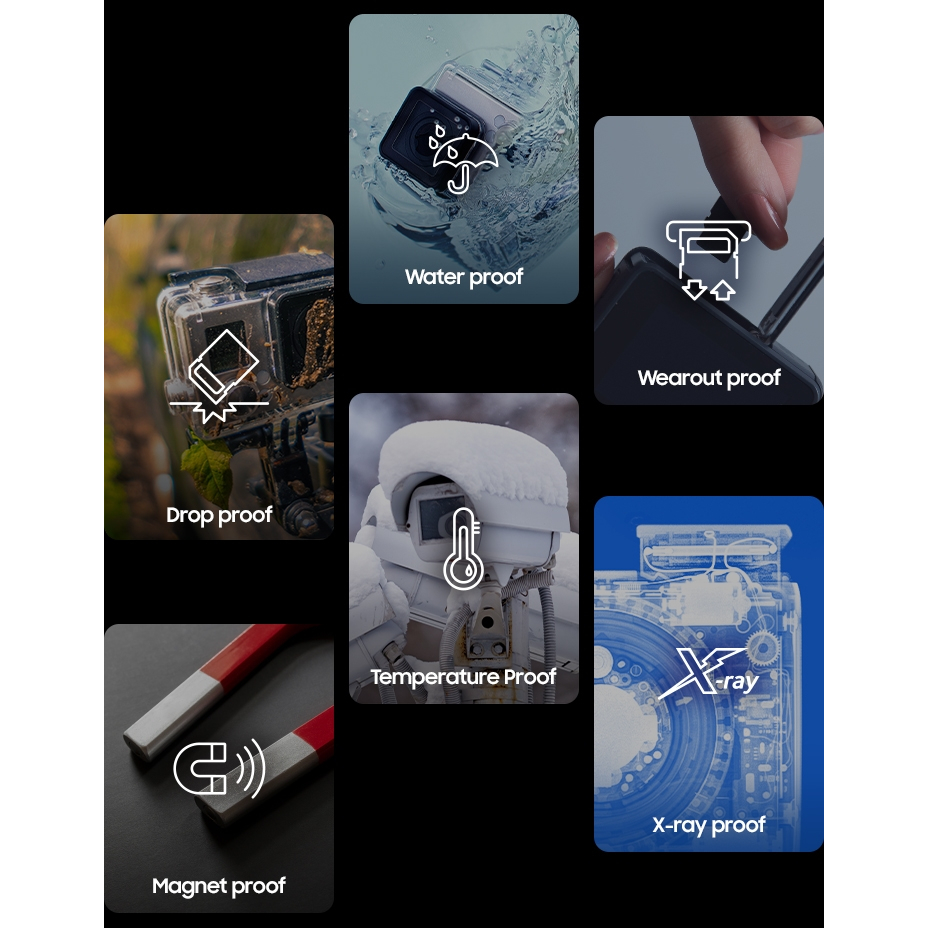 ข้อมูลที่สำคัญได้รับการปกป้อง - ตั้งแต่สภาพอากาศเลวร้ายไปจนถึงการสึกหรอที่ยาวนาน PRO Endurance ยืนหยัดต่อสถานการณ์ในโลกแห่งความเป็นจริง ผ่านการทดสอบอย่างเข้มงวดและพิสูจน์แล้วว่าทนทานต่อแม่เหล็ก รังสีเอกซ์ น้ำ และทนทานต่ออุณหภูมิการทำงานตั้งแต่ -25c ถึง 85c
