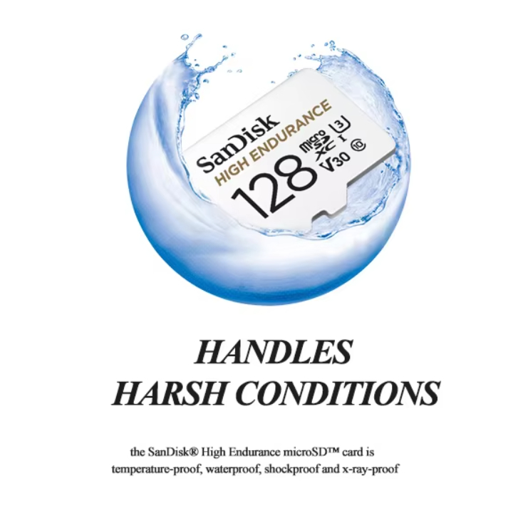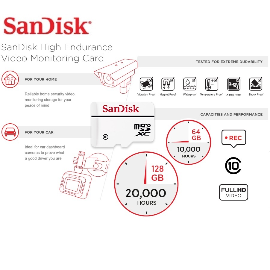 รับมือกับสภาวะที่ไม่เอื้ออำนวย - เนื่องจากบางครั้งคุณจำเป็นต้องบันทึกฟุตเทจในสภาวะที่น้อยกว่าปกติ การ์ด SanDisk High Endurance microSD จึงสามารถทนอุณหภูมิ กันน้ำ กันกระแทก และกันรังสีเอ็กซเรย์ บันทึกในรูปแบบ Full HD หรือ 4K rated Class 10 และความเร็ววิดีโอ U3 และ V30 การ์ด SanDisk High Endurance microSD มีความเร็วในการบันทึกในรูปแบบ Full HD หรือ 4K