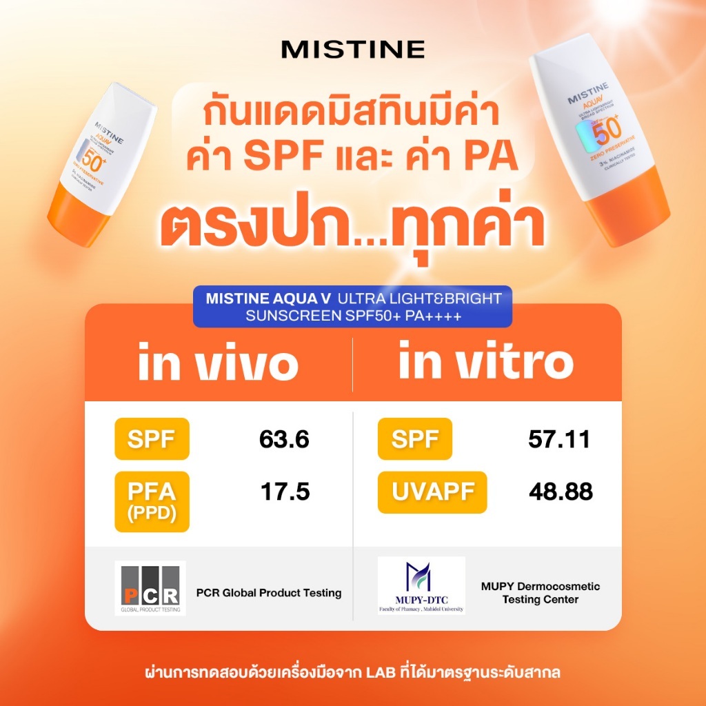 - Vitro & Vivo Tested : การทดสอบในร่างกายมนุษย์ว่าสามารถป้องกันแดดได้จริง