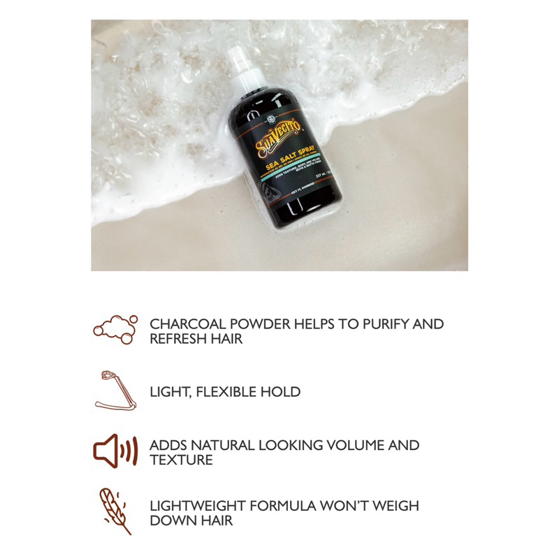 สร้างลุคที่ดูเป็นธรรมชาติและเบาๆสไตล์เท่ๆด้วย Suavecito Sea Salt Spray ที่เหมาะสำหรับการเพิ่มวอลุ่มและเนื้อสัมผัสที่ดูเป็นธรรมชาติ สเปรย์นี้สร้างความยืดหยุ่น สร้างสไตล์และการพริ้วไหวของเส้นผมคุณ อุดมด้วยเกลือทะเลและ Charcoal ที่ช่วยทำให้เส้นผมสดชื่น สูตรนี้ปราศจากแอลกอฮอล์และพาราเบน จึงไม่ทำให้ผมแห้งคงความชุ่มชื้นและสุขภาพของเส้นผมไว้