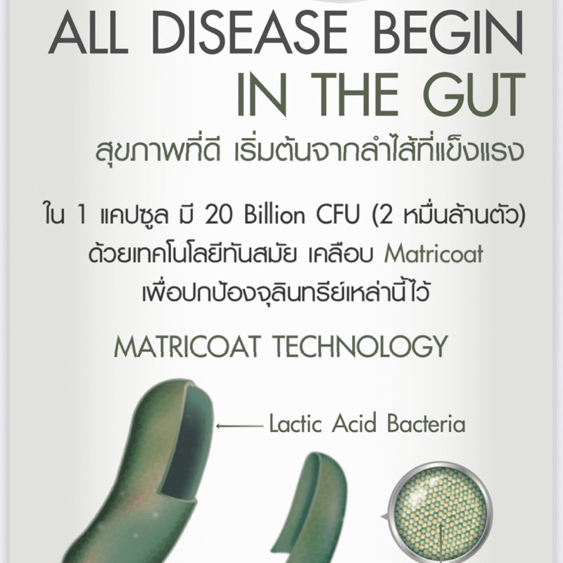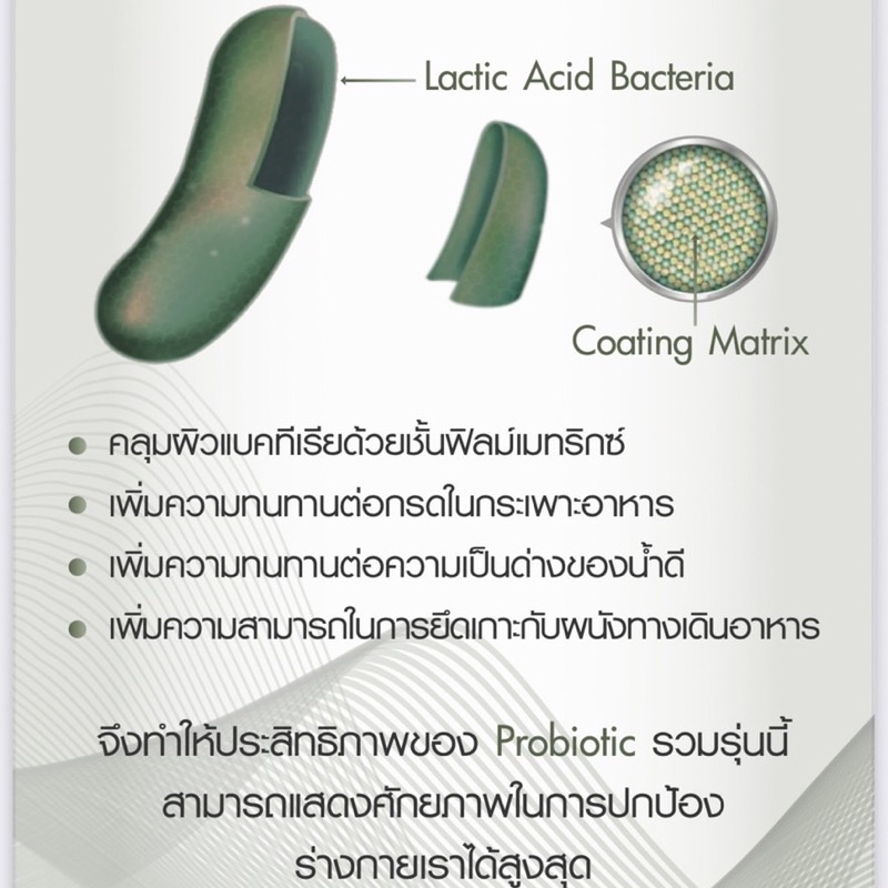 ✅ มีนวัตกรรม Matri Coat เคลือบผิวแคปซูลให้ทนกรด ทนด่าง เพิ่มความสามารถยึดเกาะลำไส้ ทำให้เชื้อจุลินทรีย์ดีสามารถออกฤทธิ์ได้ตรงจุดและมีศักยภาพสูงสุดในการปกป้องร่างกายเราได้