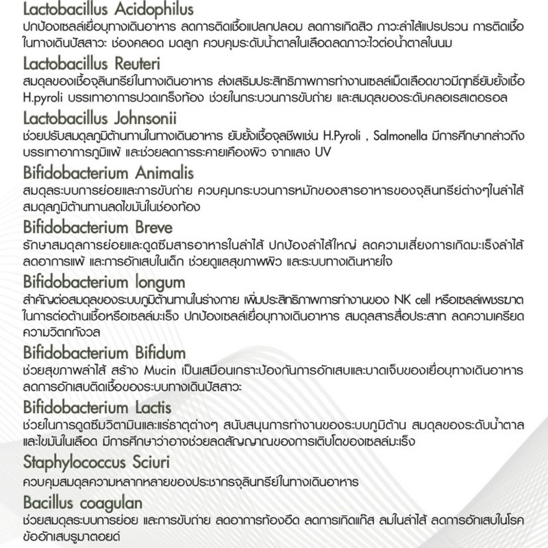 12. Bifidobacterium Bifidum : ช่วยสุขภาพลำไส้สมดุลการย่อยและการดูดซึมสารอาหาร สร้าง Mucin เป็นเสมือนเกราะป้องกันการอักเสบและบาดเจ็บของเยื่อบุทางเดินอาหาร ลดการอักเสบติดเชื้อของระบบทางเดินปัสสาวะ
