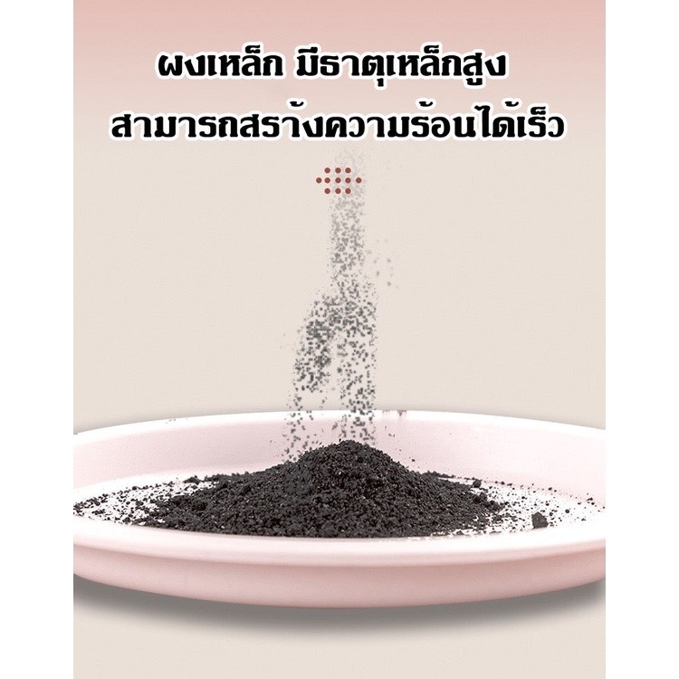 - เมือออกซิเจนทำปฏิกิริยากับส่วนผสมข้างในซองจะ ทำให้เกิดความร้อนขึ้นภายใน 5-10 นาที